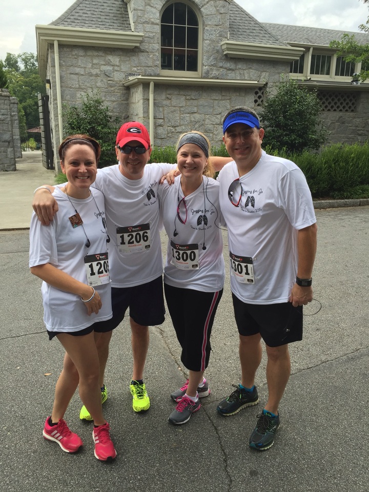 "This is my team, Jogging for Jo at the 2015 Free to Breathe 5K, at Piedmont Park in Atlanta, Georgia. My mother passed away from lung cancer almost 2 years ago and we've been doing this event in her honor ever since. This is my second year ordering team shirts from CustomInk and you guys never disappoint! Everything always looks great and comes in a timely manner. I've also used you guys for other events as well and have always been pleased with the quality and price. "