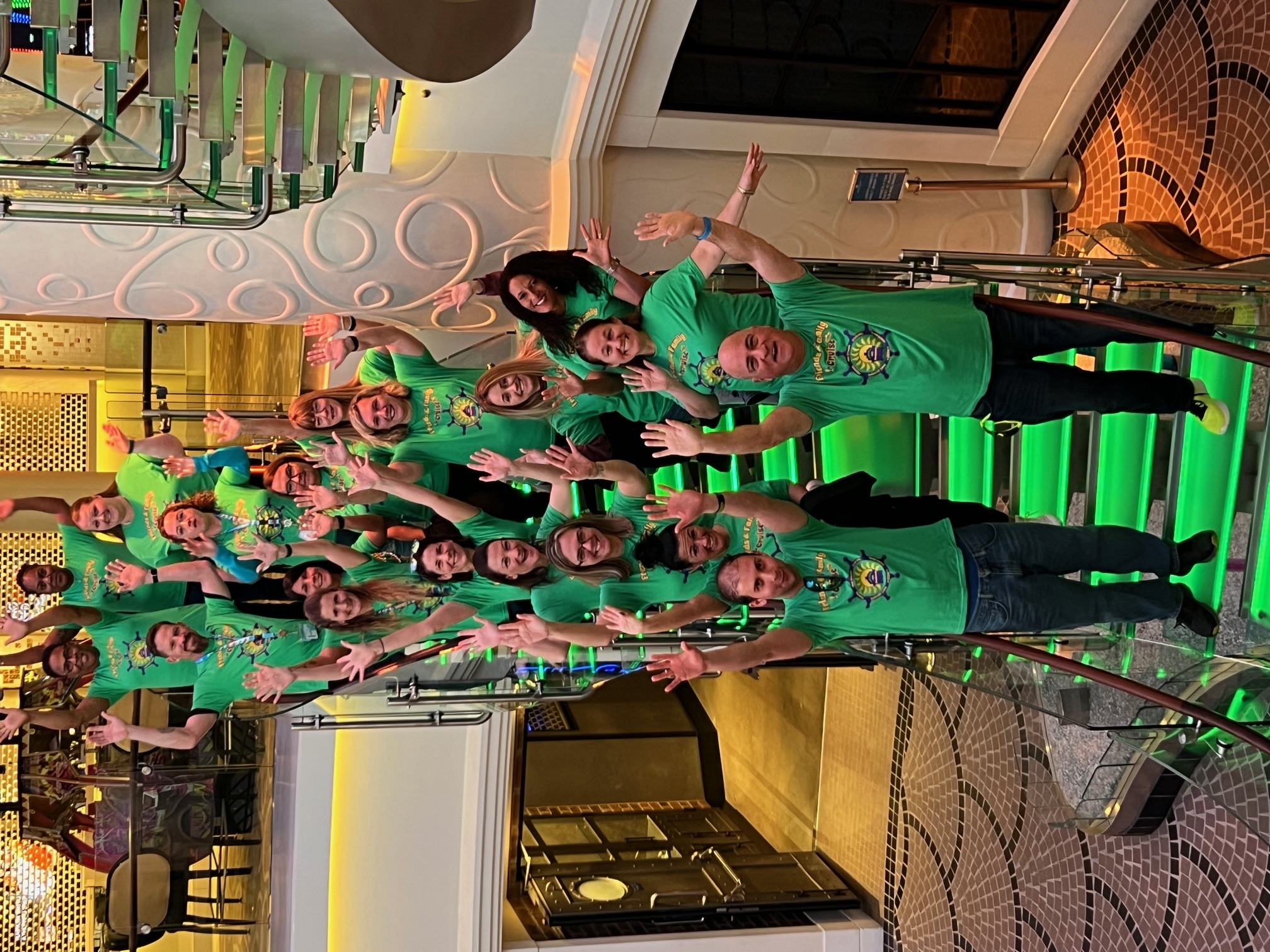 "We were on our annual Caribbean cruise called the Friends & Family cruise. We sailed from New Orleans and traveled to 4 beautiful ports, Cozumel & Costa Maya Mexico, Belize and Honduras. We were celebrating a 50th Birthday. Since we left from NOLO we went with the Mardi Gras themed shirts. We LOVED the colors and how they turned out!!! We always use Custom Ink for our t-shirts!!