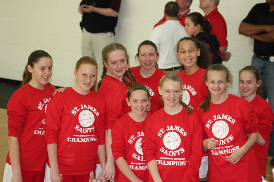 "We ordered these tshirts two weeks before our New England CYO champioships... The varisty girls just came off a huge win from their Diocesan Championshp and we wanted to recognize them for their dedication (6 day a week practices for 3 hours each day) and the ability for the entire team to have all A's and B's on their reports cards during the entire season. Custom Ink was amazing, they made sure our shirts arrived on time and in pristine condition. Their customer service was top notch and always squashed any worries we may have had. This picture was taken on April 6, 2013 at the CYO NewEngland Regional Championships... St James Saints Varsity Girls 37- 2 record for the year. Go SAINTS!!! "
