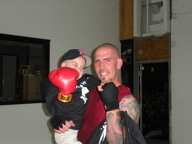 "Here is a picture of my son and husband right after my husband's boxing match. He fights as Frank The Crestmoor Hitman so we had some team hitman sweatshirts made for everyone. Our night was made extra special with our team sweatshirts."