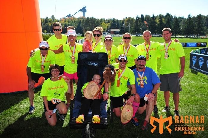 "The Giddyup Gang/Team Double H galloped across the finish line of Ragnar Adirondacks in Lake Placid, NY recently powered by Sheriff Shamus in the lead!! There is a great story about the young man in the jogger (Shamus) and his dad Shaun. Shamus has cerebral palsy and attends Double H Ranch as a camper. He and his dad are training and prepping for a cross country run to promote programs like Double H that create opportunities for exceptional children who have diseases and physical disabilities to enjoy recreation and childhood like their healthy able bodied peers! Shaun pushed Shamus over 35 miles over the course of the Ragnar relay! Shaun and Shamus will be running cross country in Summer 2015 and will give away chariots to other families so they can get out and move like they do!! #ainsleysangels #power2push"