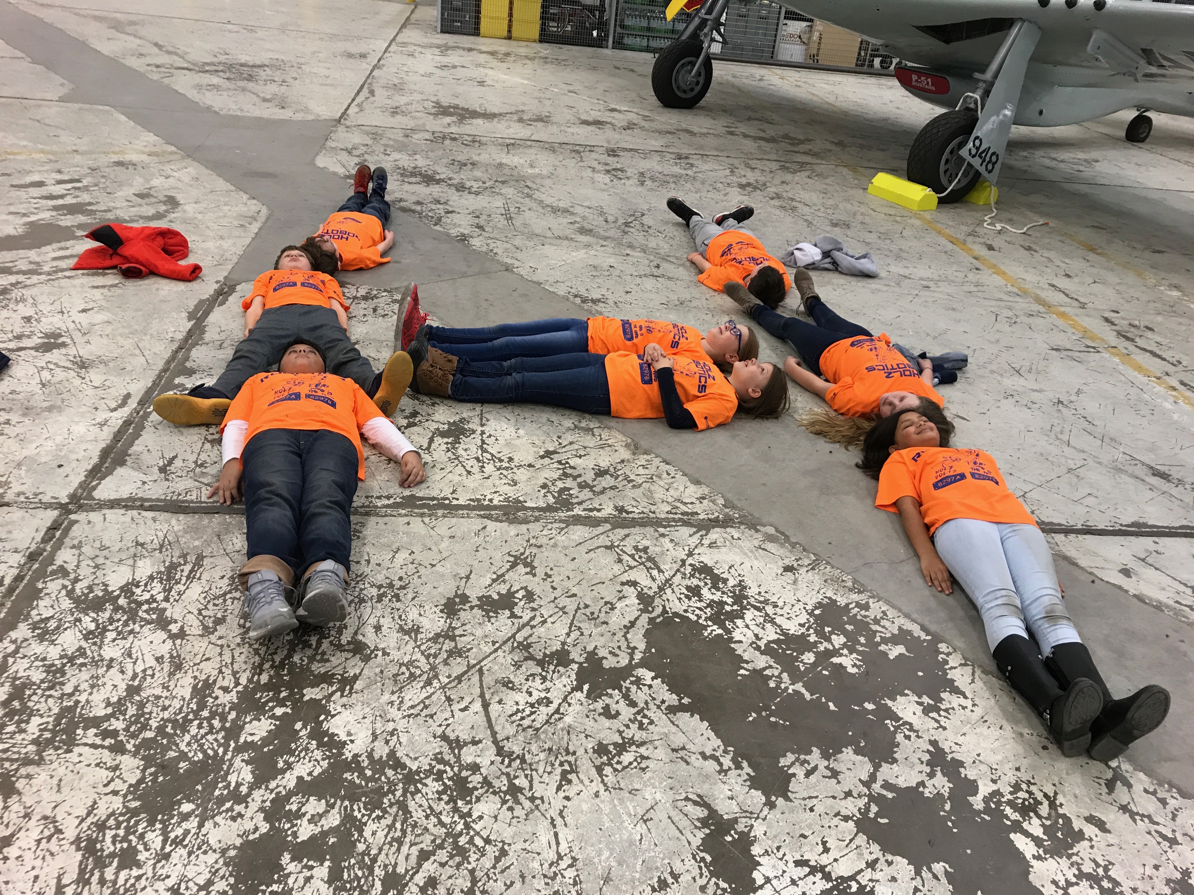 "The kids on the robotics team spelled out the letter H on the floor after winning their competition wearing their awesome t-shirts."