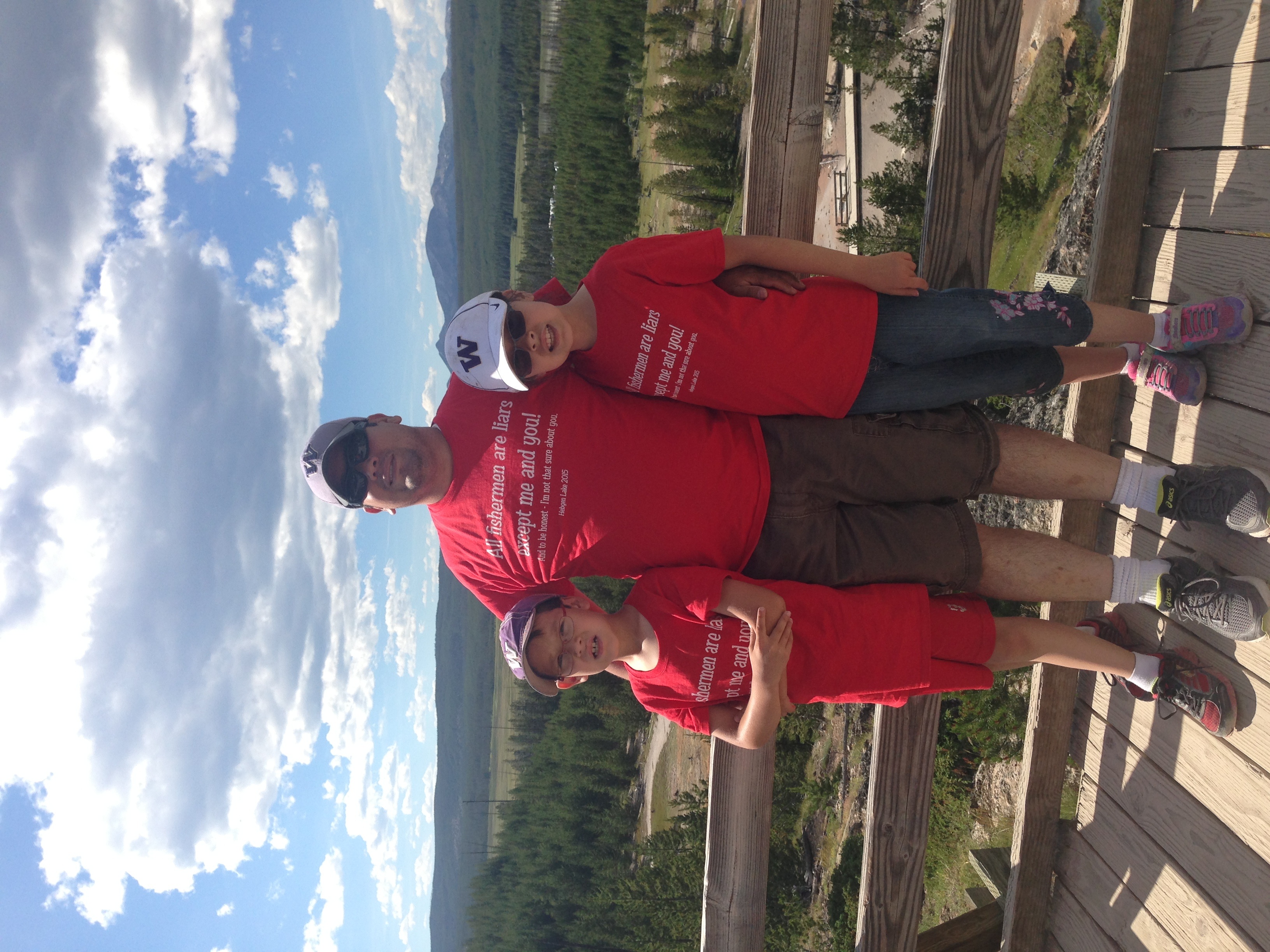 "My family had a mini family reunion. Each of the families made their own fun T-shirts. The ones we made with CustomInk blew the rest of them away. This is a shot of my small family (I'm taking the photo in my own shirt) overlooking the Artist Paintpots thermal area in Yellowstone National Park. The real artists are the Custom Ink folks for making us look great! People were stopping us on the hike to give us compliments!"