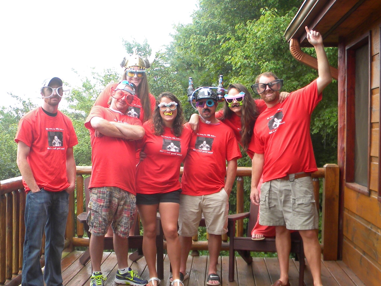 " Together with our friends, we spent the weekend celebrating my husband’s 40th birthday in a luxurious cabin in the Blue Ridge Mountains. Saturday morning everyone came down for breakfast wearing their awesome CustomInk t-shirts and the cheesiest glasses we could find. Luckily, my husband came down last, and quickly noticed everyone wearing silly glasses. Then, he noticed the shirt. As he read the shirts’ phrase aloud, “He may be 40, but he’s a real good man!” everyone burst with laughter!