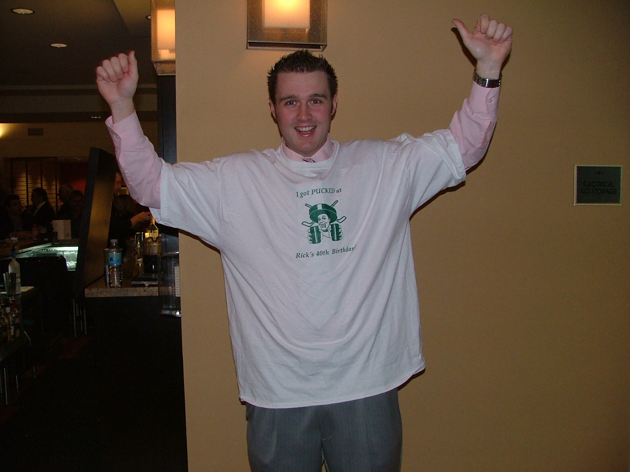 "I had a surprise 40th birthday party for my husband at our local Bakersfield Condors Hockey rink. We are both HUGE fans, and ALL of the 40 guests wore the shirts you made for us!!! After the game, we went to the local Marriott bar for drinks and ALL of the Condor players go there afterwards as well (we didn't know this, it was a great surprise). We got TONS of photos with the guys, but in this picture, one of our FAVORTIE PLAYERS, Kevin Truelson, said 'Those shirts are awesome, can I have one??' OF COURSE HE COULD...so he took off his suite jacket and wore the shirt the rest of the night! This picture is right after he put it on! I was SOOO excited!! You're t-shirt is now in a professional hockey players closet!! Awesome!! Thank you CustomInk!!!"