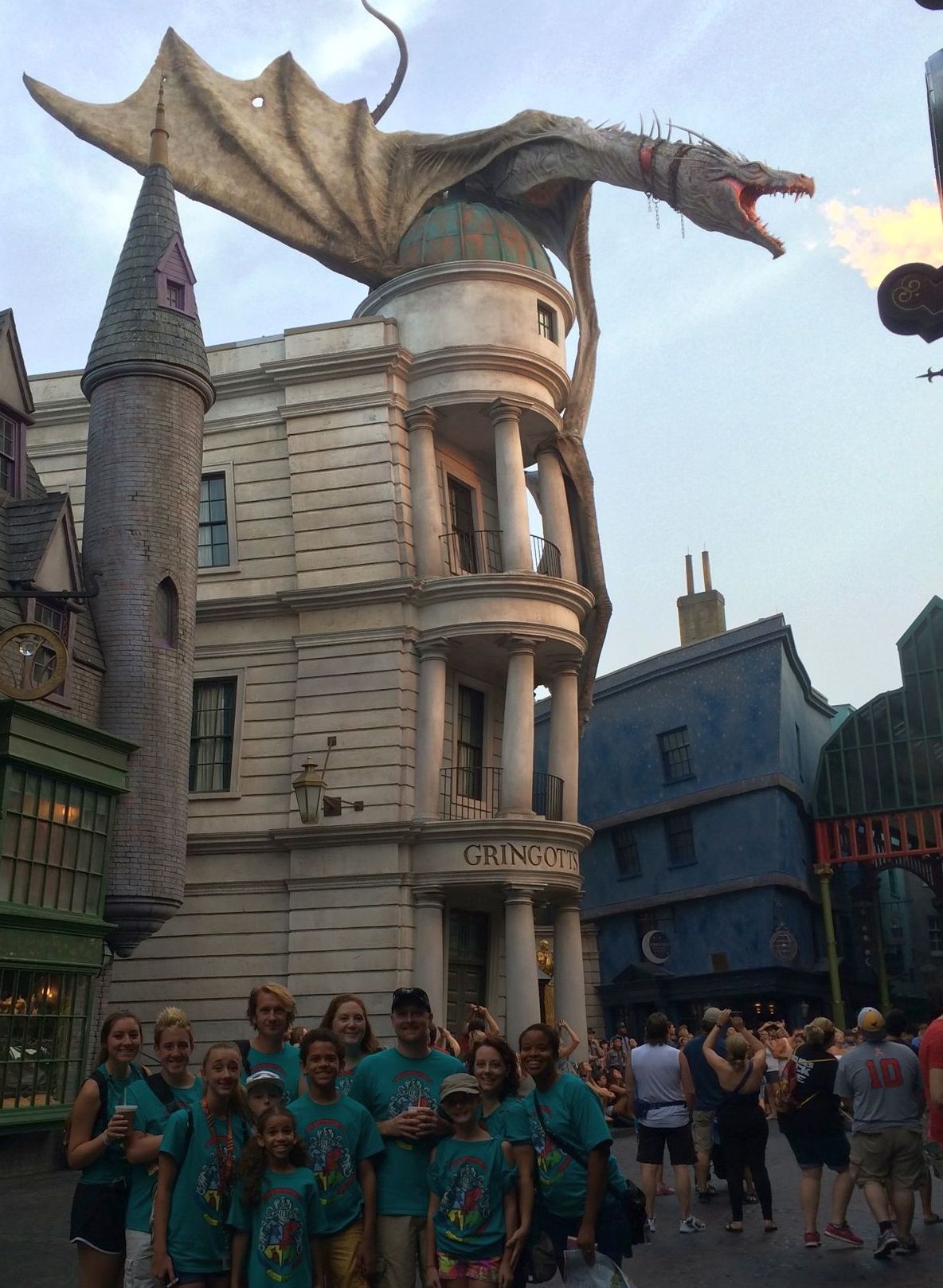 "This picture is of 3 of the 4 families that went to Universal together. We wanted a special shirt to celebrate, so we did the Hogwarts crest and changed the "houses" to animals that depicted each family. They were a HUGE hit at the park. Many people stopped us and asked us where we got them. It also got us free butterbeer! :-)