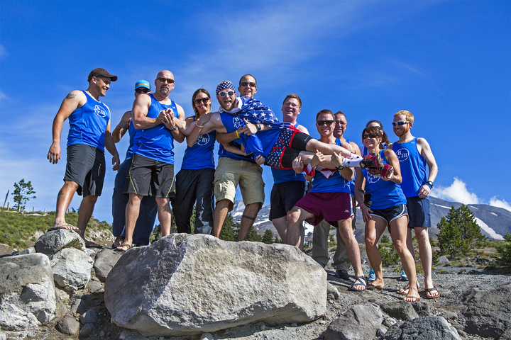 "Here is a picture of Team Bourbon-Buzzed & Blistered (Team BIII) in our sweet New Balance tank tops at Timberline Lodge, Mount Hood, Oregon before the start of the 200 mile 12 man Hood to Coast Relay!