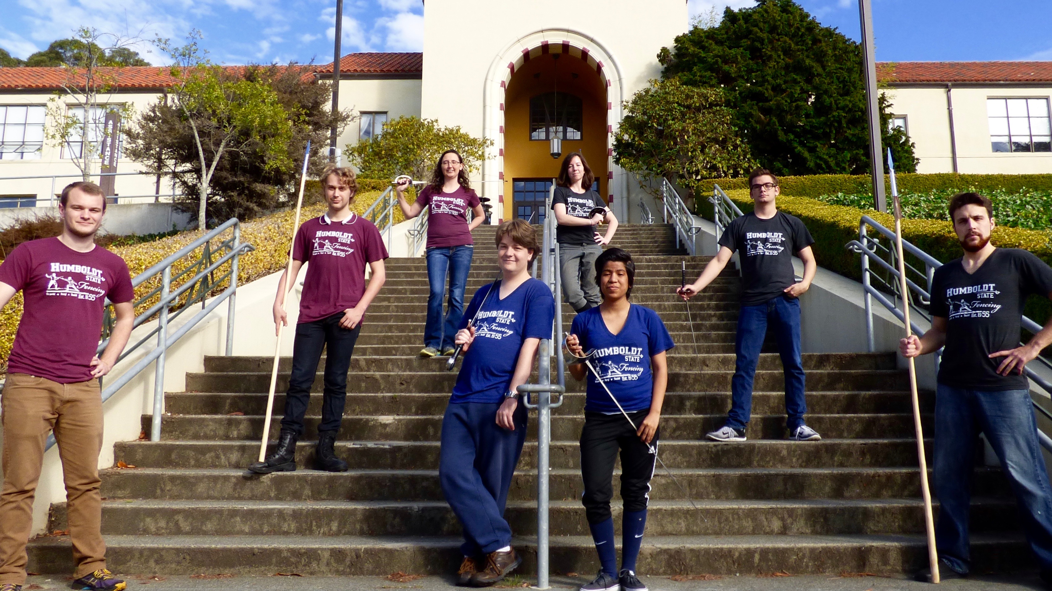 "This picture was taken in front of founders hall, the oldest building on the Humboldt State University campus and a symbol of Humboldt pride. The students in the photo are members of the HSU Fencing Club, founded in 1955 and one of the oldest sports clubs on campus. We chose this spot to take the photograph to symbolize our history with HSU, as well as choosing to hold various practice weapons in the photo to show the diversity of arms the HSU Fencing Club practices. Our experience working with CustomInk was great, they helped answer any questions we had and were very quick to reply. This year we were even able to get our design on multiple color shirts, we couldn't be happier with the outcome."