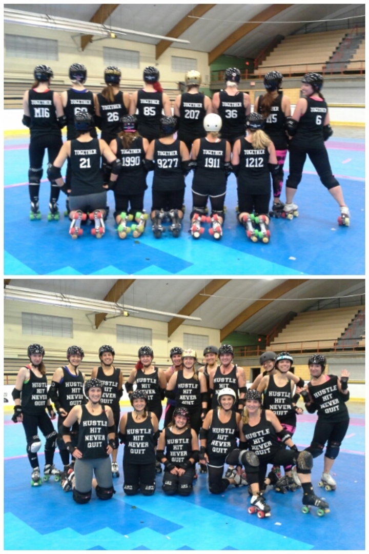 We wanted to go to D1 with shirts that would remind us how we got there. With our team mantra, Hustle, Hit, Never Quit – Together. We say that cheer after every practice, scrimmage, and bout. It’s what our fans chant while were playing. It’s what has banded us together and personified how we work as a team. When we ordered our shirts we decided to get that printed as large as we could on the front. On the back we all had Custom Ink print “Together” over our numbers. No individual names on our shirts, just one team…together.