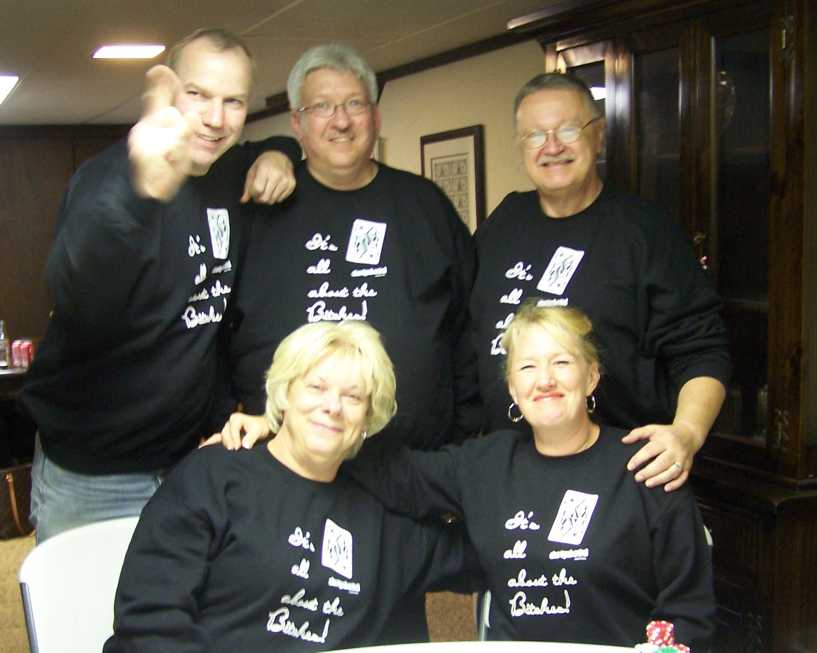The Queen's are the highest trump, the most powerful cards, and they are ofte referred to as the "b&^%*es". So, no reflection on the "ladies" here wearing the shirts."