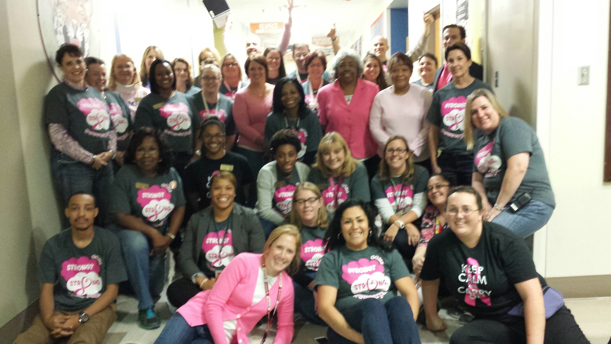 "Guion Creek Middle School teachers and staff showed support at our Pink Day to support Breast Cancer Awareness. We have several staff members who are survivors and many more who have family and friends who have fought breast cancer. Selling the customink tees was a fundraiser for the cheerleaders which raised over $600. A portion of that will be donated to cancer research in honor of one of our students who is currently battling cancer."