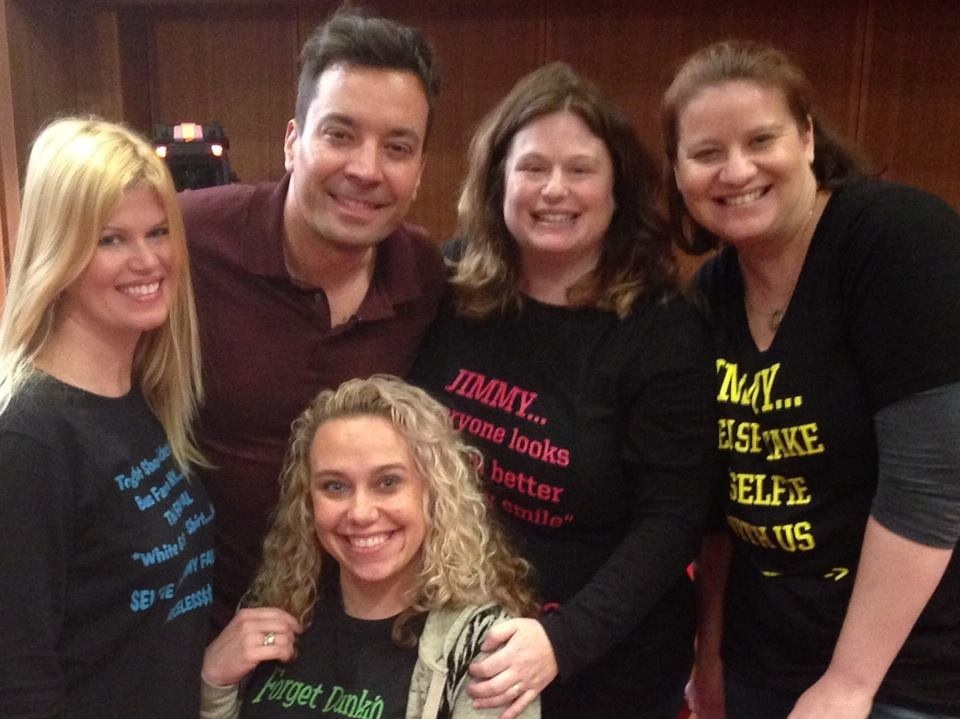 "We wanted to get Jimmy Fallon's attention in a crowded Tonight Show audience so we all made custom shirts from CustomInk. We weren't in the studio more then a minute and he came over and had us each stand up as he read each of our shirts one by one. He loved them and we got this great picture and amazing memory! Thanks CustomInk!"