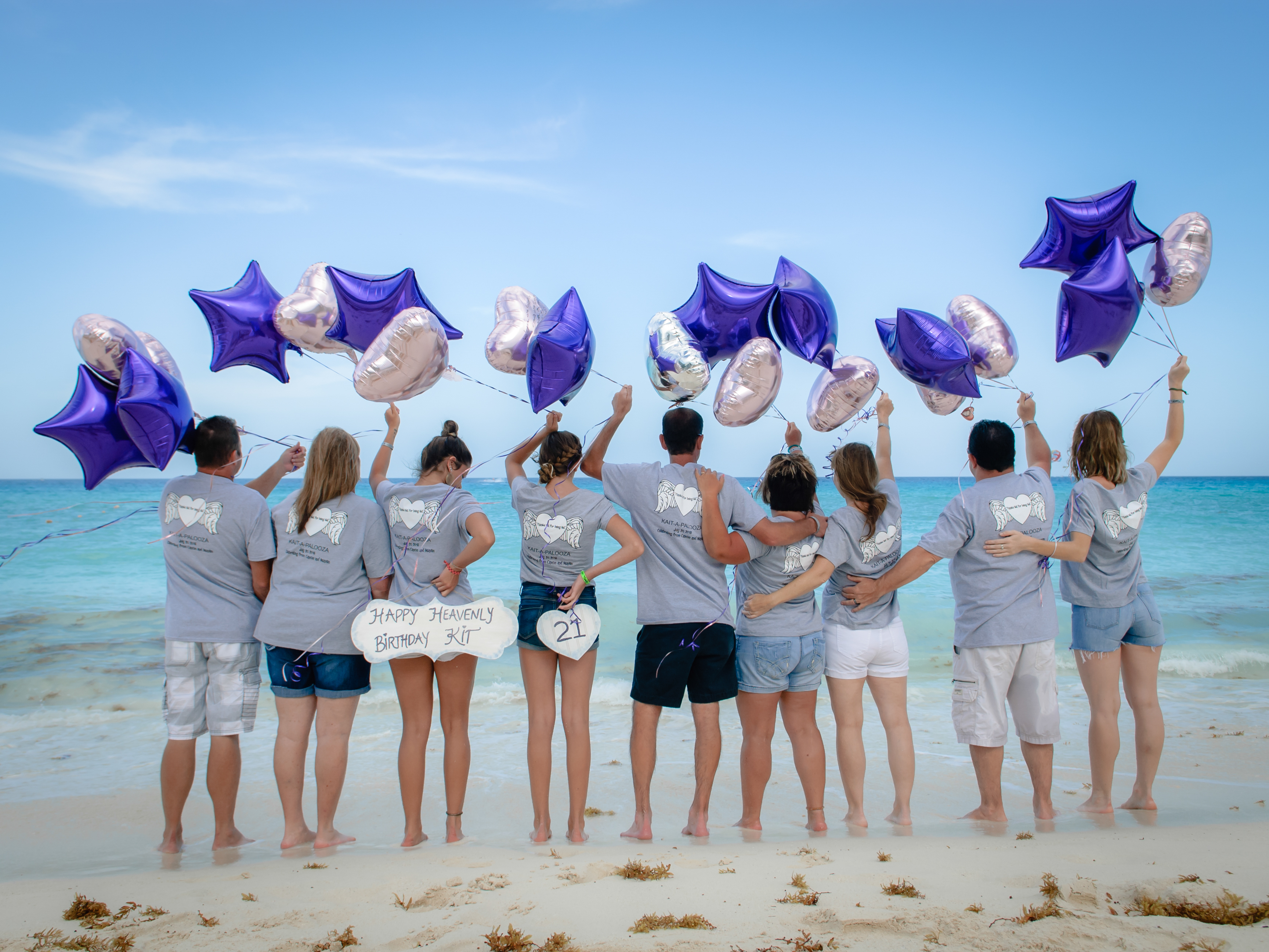 "My niece, Kaitlin, had been killed in a horrific car accident several months before her 21st birthday. She had always referred to her birthday month as "Kait-A-Palooza", and we were determined to celebrate her 21st birthday for her in grand style. Her parents, sisters, aunts, uncles, and cousin came from all over the US to celebrate in Cancun, Mexico while she celebrated from Heaven. We wore our custom printed shirts and released balloons over the Caribbean at sunset in her honor.