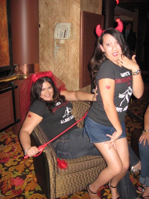 "Ten crazy girls celebrating Kathy's Bachelorette weekend in Laughlin, NV. Front of Shirt: "Kathy's Bachelorettorama 2008...Almost Married...