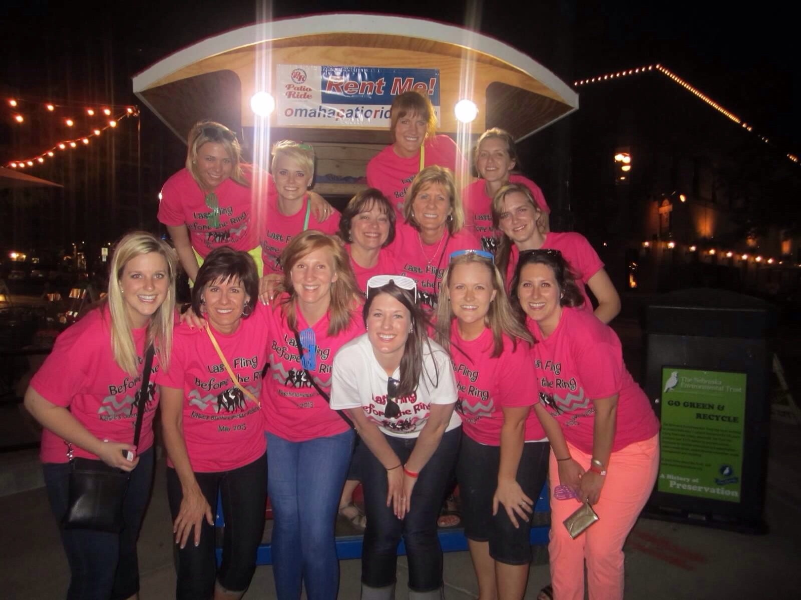 "My sisters bachelorette party - night one! We rode a patio bike to do a pub crawl in downtown Omaha. We had a blast and got a ton of comments on our awesome shirts. Loved how they turned out - thank you custom ink!!!!"