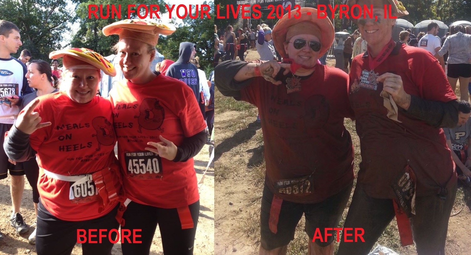 "Meals on Heels was a two person team that ran the Run for Your Lives 2013 Zombie 5K in Byron, IL on 9/21/13. This was a 3.1 mile course with challenging obstacles like crawling under barbed wire, swimming through muddy water and crawling through smoke houses filled will electrical wires hanging from the ceiling. ALL while having zombies chase you! You can see the before and after photos of team Meals on Heels sporting our CustomInk made team shirts. Our outfits were a hit and we survived the zombie apocalypse! We did this race because it was something different and a challenge.