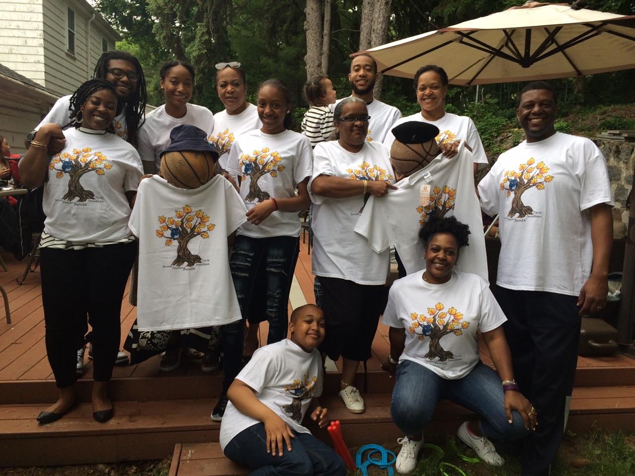 "Family cookout for memorial day. Shirt symbolizes siblings as roots of the tree with all our children as leaves and owl is for our deceased mother watching over family. .still"