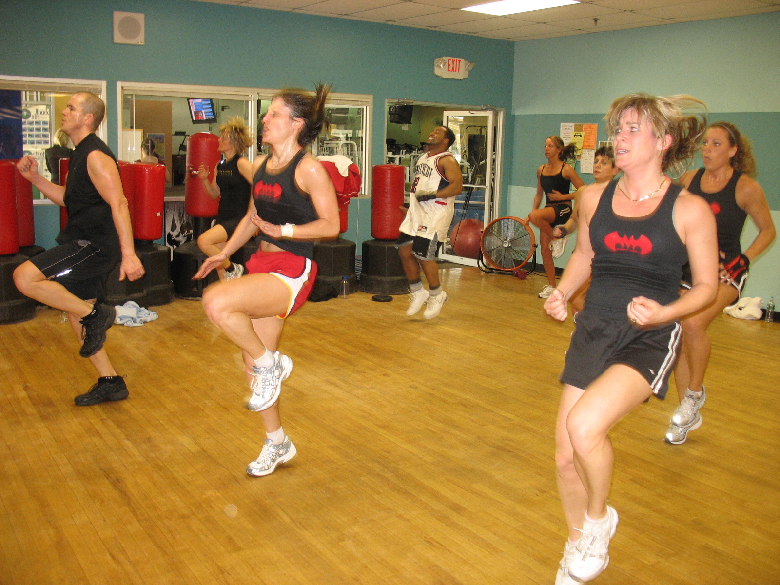"This was MM5, the 5th edition in a series of extreme boot-camp classes I have offered at the New England Athletic Club in Cromwell, CT. The shirts feature the MM logo -- two M's in the shape of a Bat -- with the words "Official MM Warrior -- Sambat Certified -- Fear the Batman!" on the back. The folks who take this class are fierce, strong, and loyal -- in case you didn't figure that out from the photos. This pic was taken near the end of the class, as the music really picked up speed and everyone was wondering when it was going to end. The shirts really show off the results of the class on these incredible athletes, which is why I chose the design, color, and overall layout. Great job, CustomInk!"