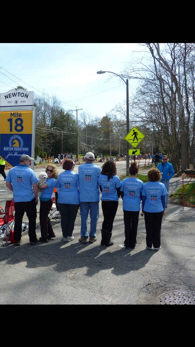 "This is our family at mile 18 of the Boston Marathon, cheering on my husband while he runs! It's a little hard to see, but the front of the shirts say "Boston Marathon April 21, 2014" and the backs say "Keep going, Albert!! There's carrot cake at the finish!!", with some little carrots at the bottom. Carrot cake is a favorite in our family and what better motivation to keep going than that?! Working with Custom Ink has been great both times we made shirts for my husband running Boston and we plan to use Custom Ink again in the future!"