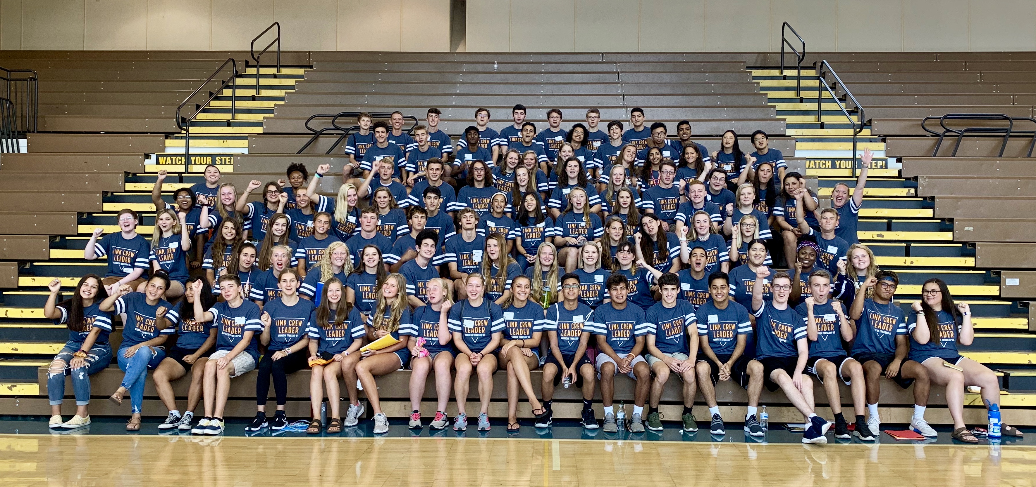 "This photo represents 100+ Link Crew Leaders after 5 hours of facilitating Freshman Orientation. They eagerly met the incoming ninth graders, played games, and conducted peer-building activities. The beginnings of a positive mentorship began as freshmen were paired with upperclassmen who will serve as role models in navigating the difficult high school years. Our group is committed to decrease bullying and discipline referrals, increase attendance and graduation rates, and to foster a strongly spirited community. Our leaders are family, and they welcomed more than 400 freshman students into it with open arms today!"