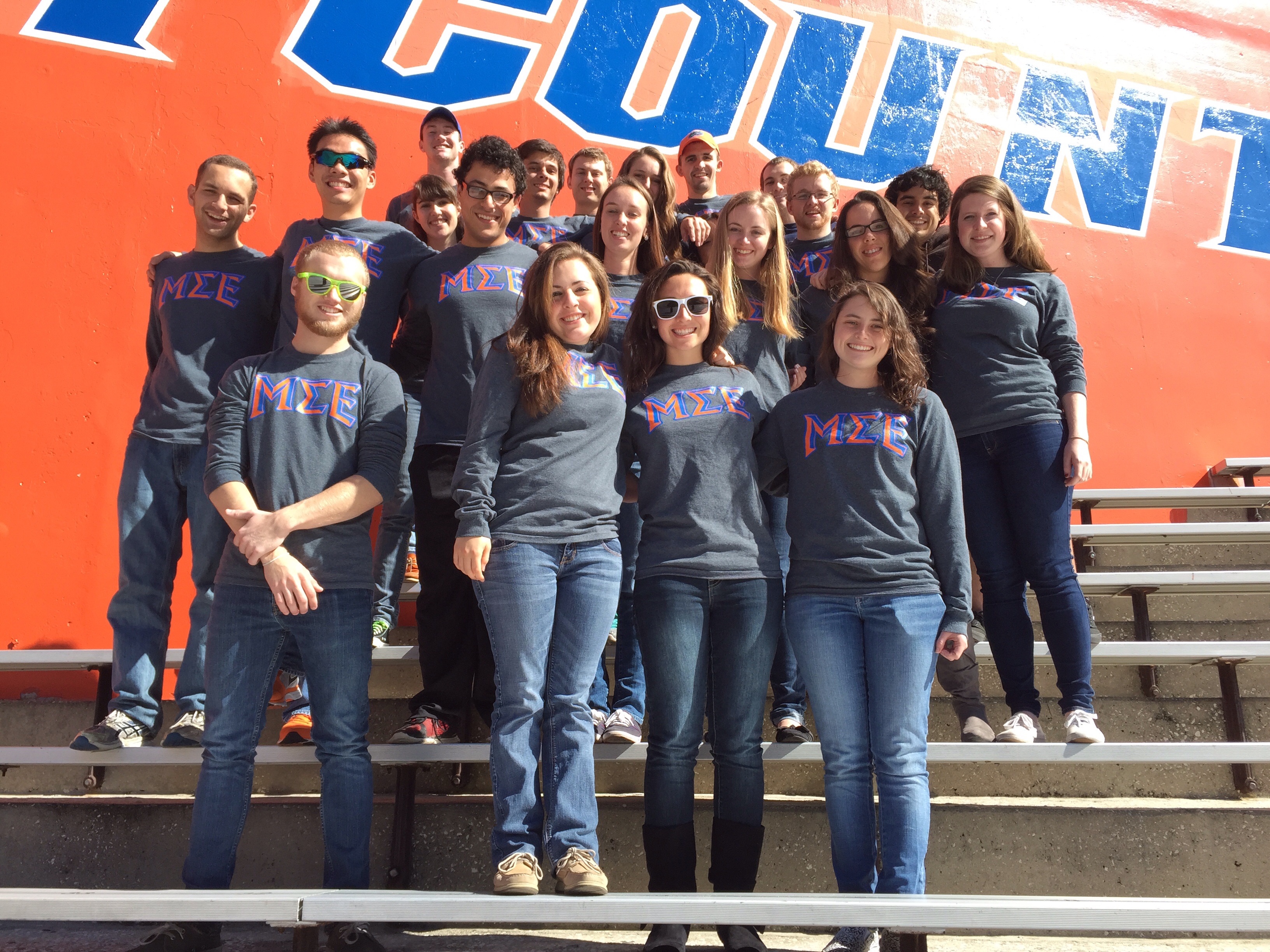 "We are a group of materials science engineers at the University of Florida that decided to get frat letters on a shirt. We are a close knit group that studies together as well as hangs out. We took our picture in the SWAMP (Florida field). We all love our shirts and wear them every Monday for "MU SIG Monday"