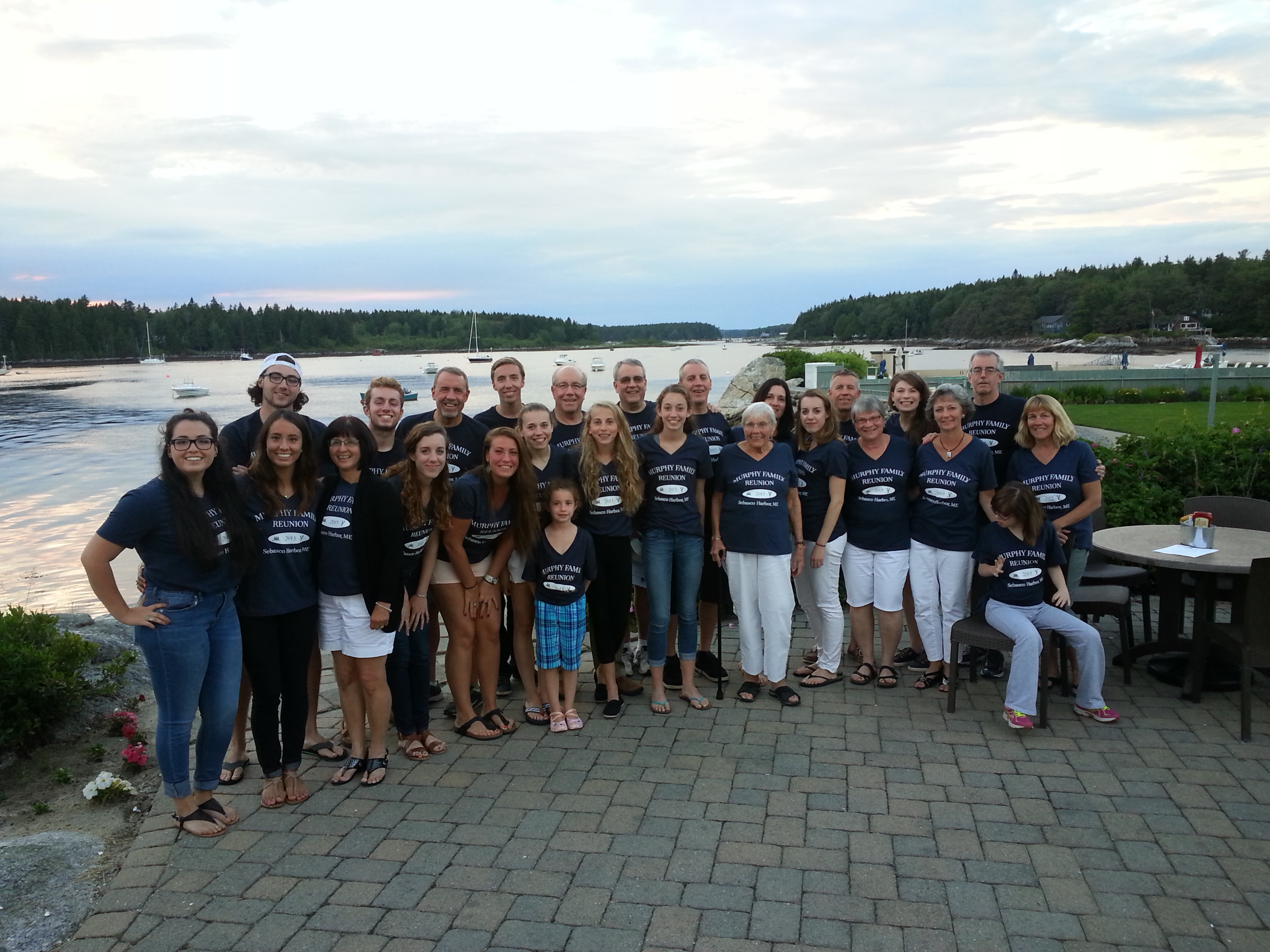 "Team Photo taken at Sabasco Harbor Resort in Phippsburg, Maine. Mom is center stage with her six kids, spouses and grandchildren (26 total). Great gathering and great shirts to commemorate this wonderful gathering.
