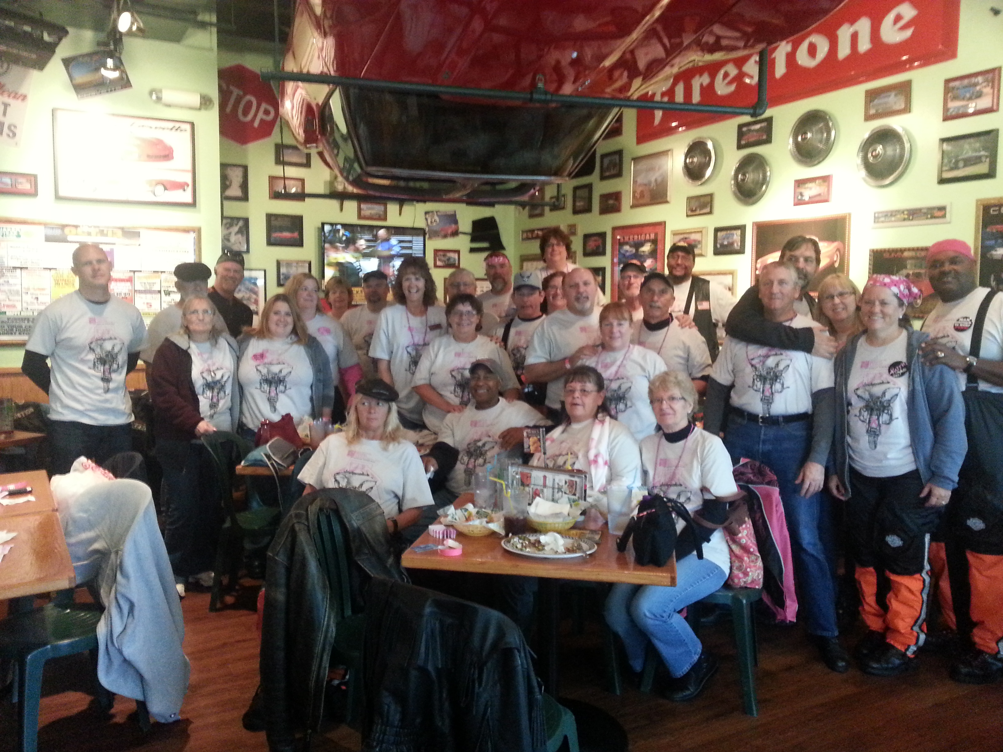 "East Coast Harley Owners Group hosted a poker run to benefit the National Breast Cancer Foundation. We sold 88 T-shirts advertising the event with proceeds donated to the charity. This is us at the end of the run."
