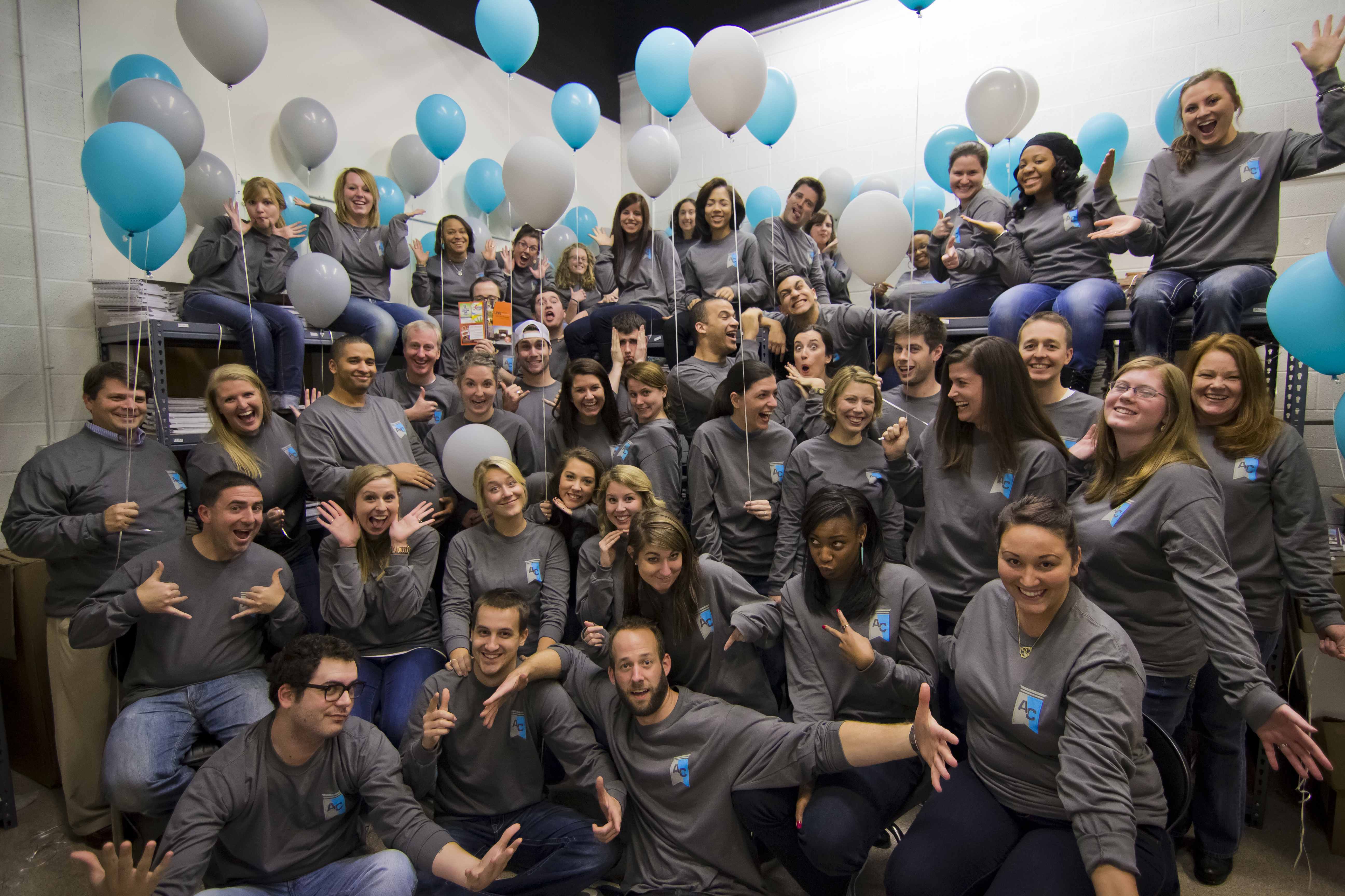 "We recently changed our company name, so as a surprise we ordered everyone new long sleeve T-shirts. Everyone was super excited to get their first piece of new-company swag. On casual Friday of "launch week" (for our new name) we all gathered for a photo and some shenanigans in our warehouse.