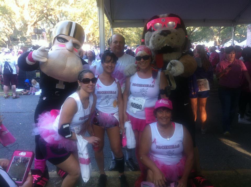"This wasn't our entire team, but this was at the Susan Komen Cure for Cancer race In City Park in New Orleans. We participate in this event every year because my sister (the one in the pink hat) is a breast cancer survivor. This was the first year we got a team t shirt and my experience with CustomInk was just perfect. Our team was photographed quite a bit!!! There were quite a few "celebrities" including N.O. Saints mascots Sir Saint and Gumbo."