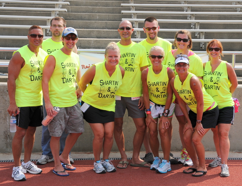 "This is a photo of our 6 person relay team and our 4 person road crew for a 100 mile relay race that takes place in Bloomington, IN. Teams of runners run country roads and agonizing hills throughout the night to total 100 miles. Our team came in second in the Mixed Open category. We took one hour off of our time from last year, finishing 100 hilly, dark miles in 14 hours 43 minutes and came in only 4 minutes behind a team of high school cross country girls! Not bad for a bunch fo 40 somethings!! Thank you sooo much for getting our shirts to us on time (after numerous phone calls to change names and sizes!!) Your team is awesome! This is my second order and I will not hesitate to return for our next event. Rock On Custom Ink and Team Shartin & Dartin!!!"