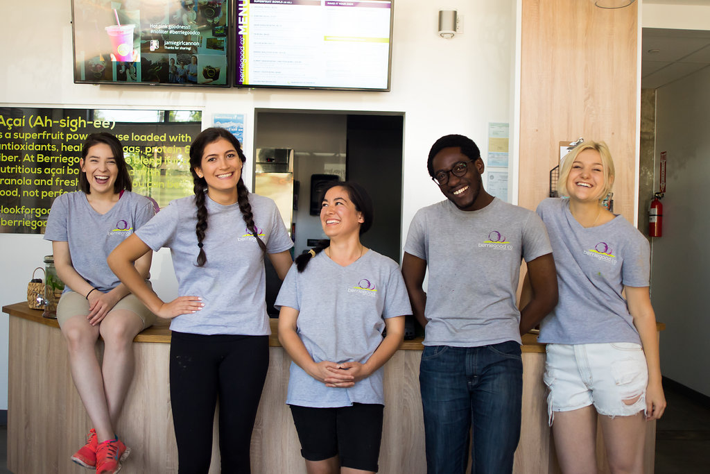 "Team Berriegood Co., taking a pause to pose in their CustomInk t-shirts, from making acai superfruit meals in a bowl in Denver, CO."
