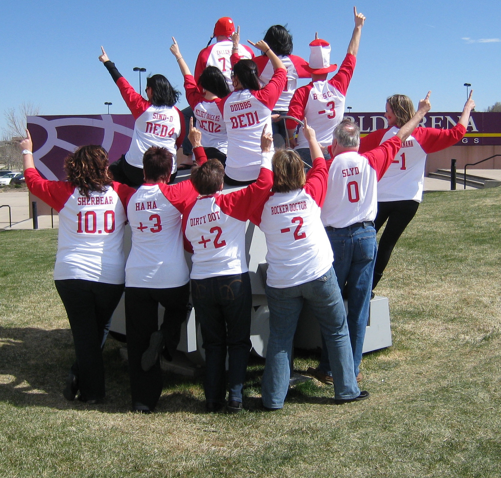 "We are Team Bosco 2010, a group of volunteer figure skating officials from Canada that traveled together to Colorado Springs, CO to cheer on the two Canadian entries in the 2010 ISU World Synchronized Skating Championships. Our custom shirts all have special nicknames on the back that reflect our personalities, along with "scores" that reflect the marks that are awarded to skaters and teams under the current ISU judging system for figure skating. CustomInk did an AMAZING job at helping us design and produce these special one-of-a-kind shirts, and we were the talk of the entire event!! We had fans from all over the world come up to us and tell us not only how much they loved our spirit and energy and cheering throughout the event, but that our special shirts with the figure skating marks were ingenius and extremely unique. We often made the Jumbotron during the intermissions with our dancing and special shirts, and we wore them everywhere we went for the two days that the event was taking place. We even carried a bunch of Tide-To-Go pens with us in case we happened to spill anything on them, as we didn't want them to be ruined!"