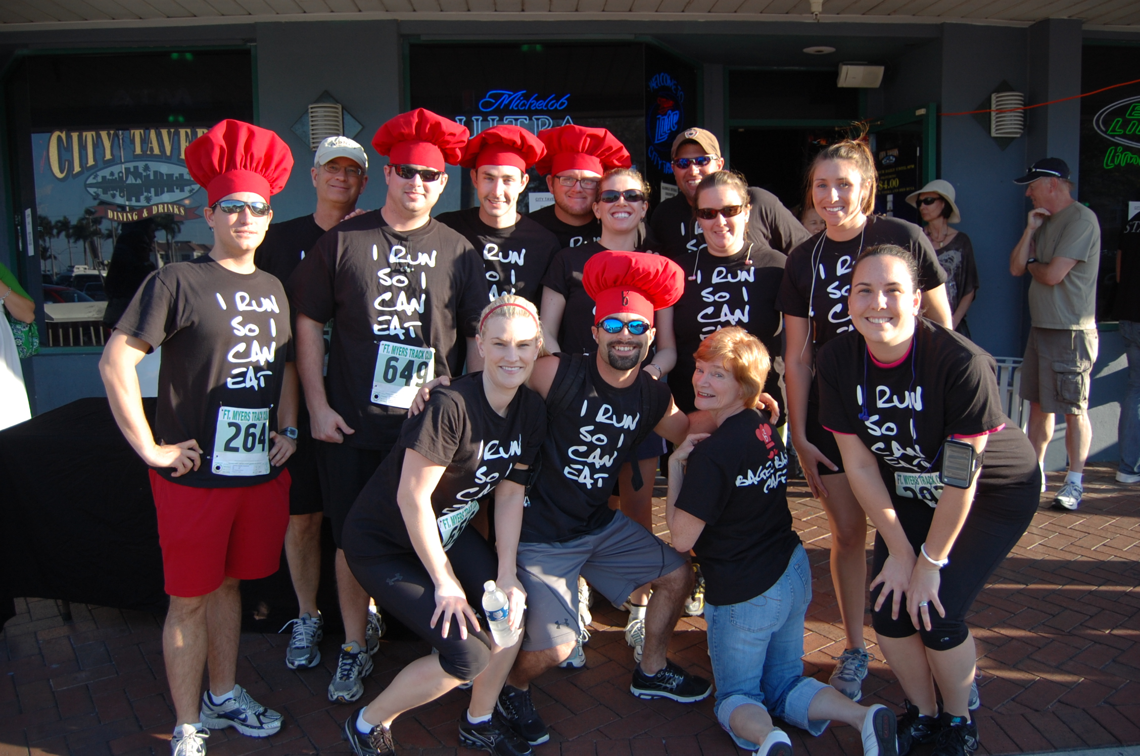 "Each year we gather our closest friends to create a spectacle and shamelessly promote our Bagel shop, Bagel Bagel Cafe at the Edison Festival of Light 5k Run in Fort Myers, FL. The front of the shirts say 'I RUN SO I CAN EAT', the back has the name of our shop. You should hear all the spectators (there are thousands) yelling 'Hey Bagel Bagel' as we run by. This year we even made the center page of the local newspaper!