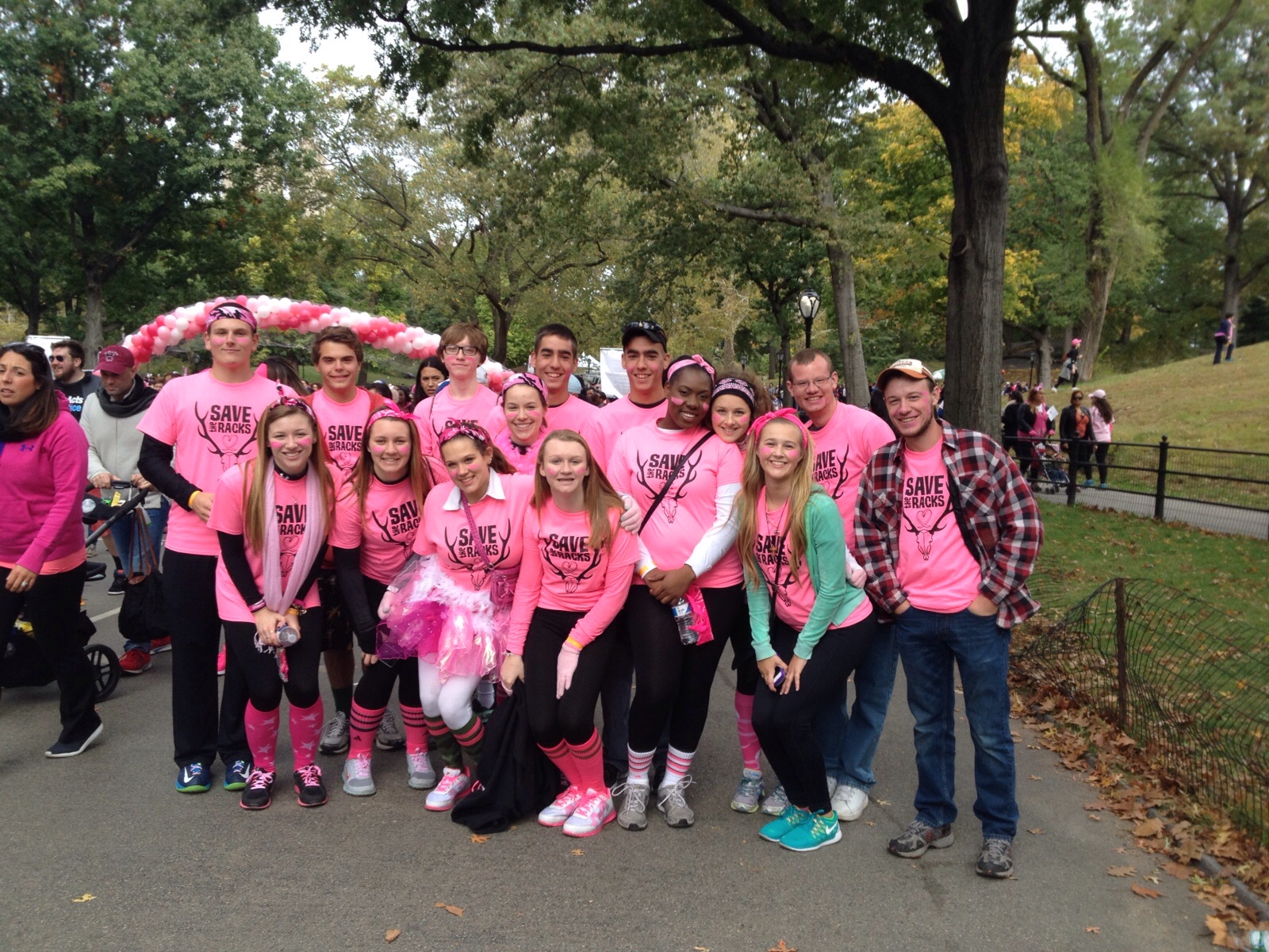 "We walked in a fundraiser for Breast Cancer in Central Park in honor of my friend's mom who passed away in May 2014. We all like country music so we decided to go with a country themed shirt! Save the Racks!"