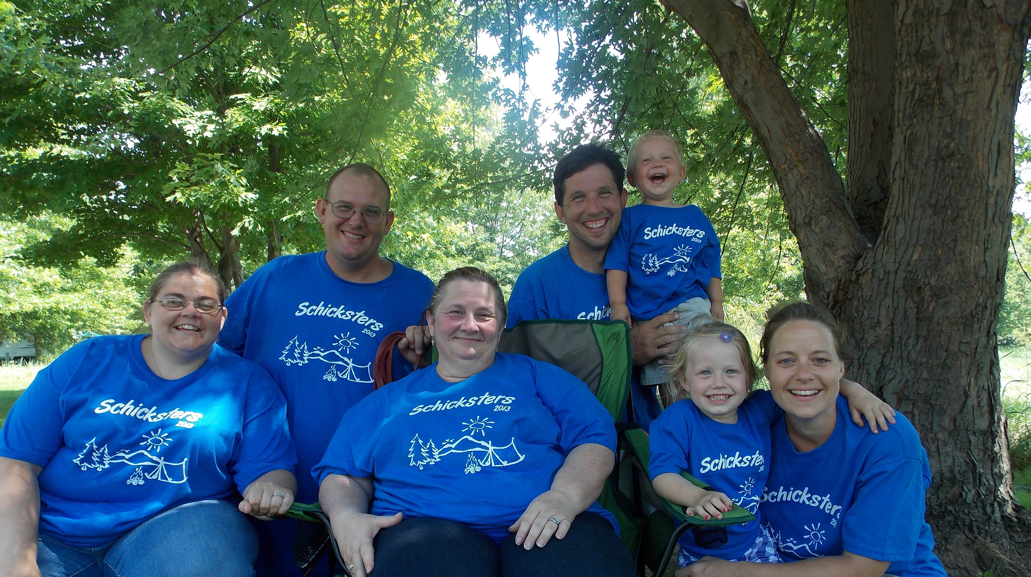 "We attend a large family camping week. We are just one of many family names that attend, but 2013 is the first full week event my grandchildren ever attended. We had over 5 camp sites, but just 7 Schick's. So we got matching shirts to show off a little just for fun. We have photos of the little ones in their shirts on a merry-round and one of my son playing volleyball in a flooded sand volley ball court- photos available upon request. LOL. (First we had days of scalding heat followed by a major storm that flooded camp sites as well as the court) We will forever be able to date which year these photos are from. The girls I worked with at Customink were wonderful. The one said they enjoy their job and it shows. She had all the patience any customer could ever ask for and went above and beyond helping me with sizing. As you can see, I had a wide variety of sizes needed. And I was promised the shirts would arrive on a certain day, and they did! Your contact info is now on file and will be my one and only stop for the next set of fun shirts. Thanks to you we were the talk of camp!"