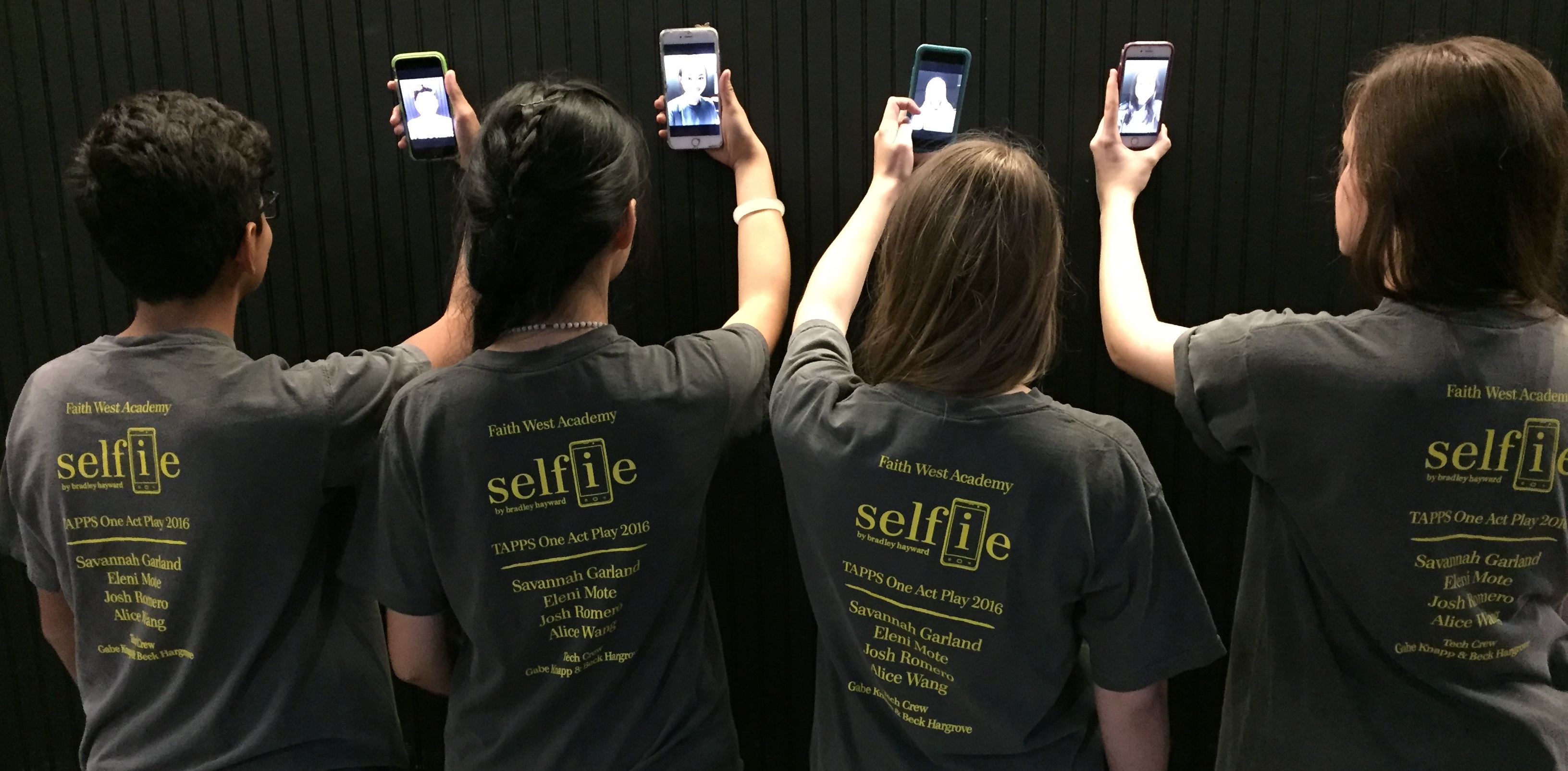 "This is the cast of Selfie by Bradley Hayward at Faith West Academy in Katy, TX. It is our one act competition play this year for state. These students, who are all members of the International Thespian Society Troupe 8225, are working so hard by taking on two characters each for this show. Selfie is about high school seniors and how they document their year, one click at a time, through selfies. The shirts are also their costumes so they can add a shirt, sweater, glasses or hat to change from one character to another. These shirts are going to hold so many memories for these students for years to come. Thank you."