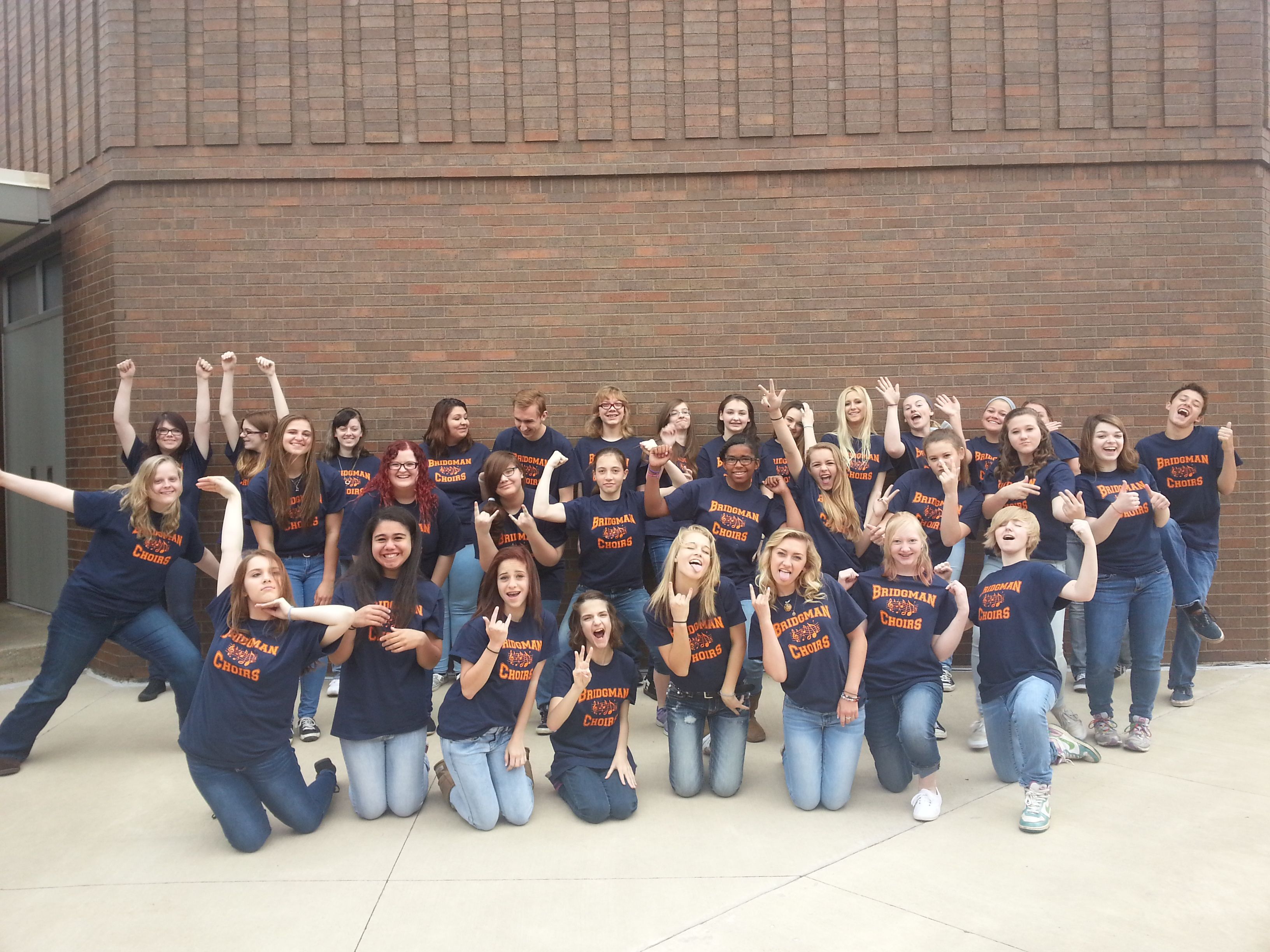 "Getting ready to head out to sing "The National Anthem" for the South Bend Cubs. This was our fifth year to singing for them. Our choir parents donated the money to allow every choir student to have a shirt."