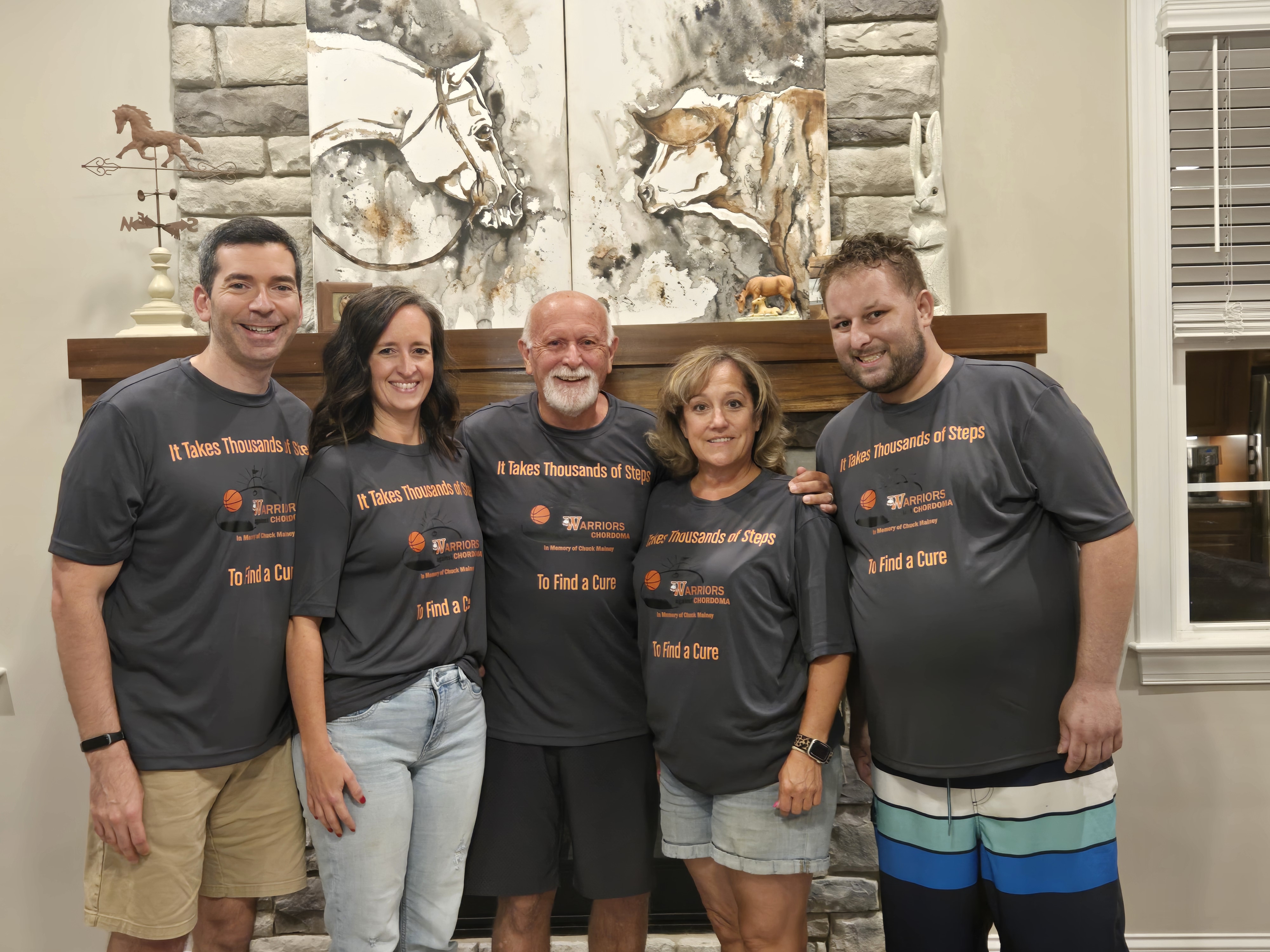 "I had customink make custom shirts for my fundraiser for the Chordoma Foundation in memory of my son Chuck Mainey. In the photo is from left to right, my son-in-law Tim Sharpe, Chrissy Sharpe (Chuck's sister), John Mainey, Terri Mainey (my wife) and Andrew Yeager ( Chuck's brother)."