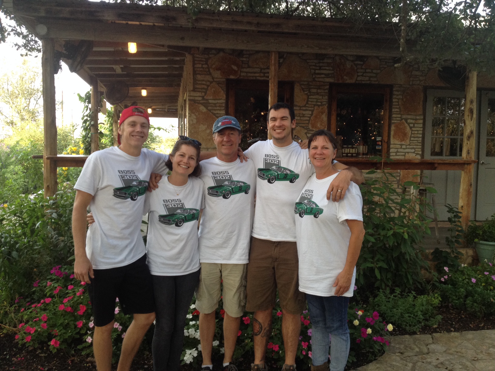 "My dad (in the middle) raced his 1970 Mustang Boss 302 for the SVRA Championship race at the Circuit of the Americas (the same track that Formula 1 races on) in Austin, TX for the first time. I surprised my dad with custom made t-shirts and he loved them. "