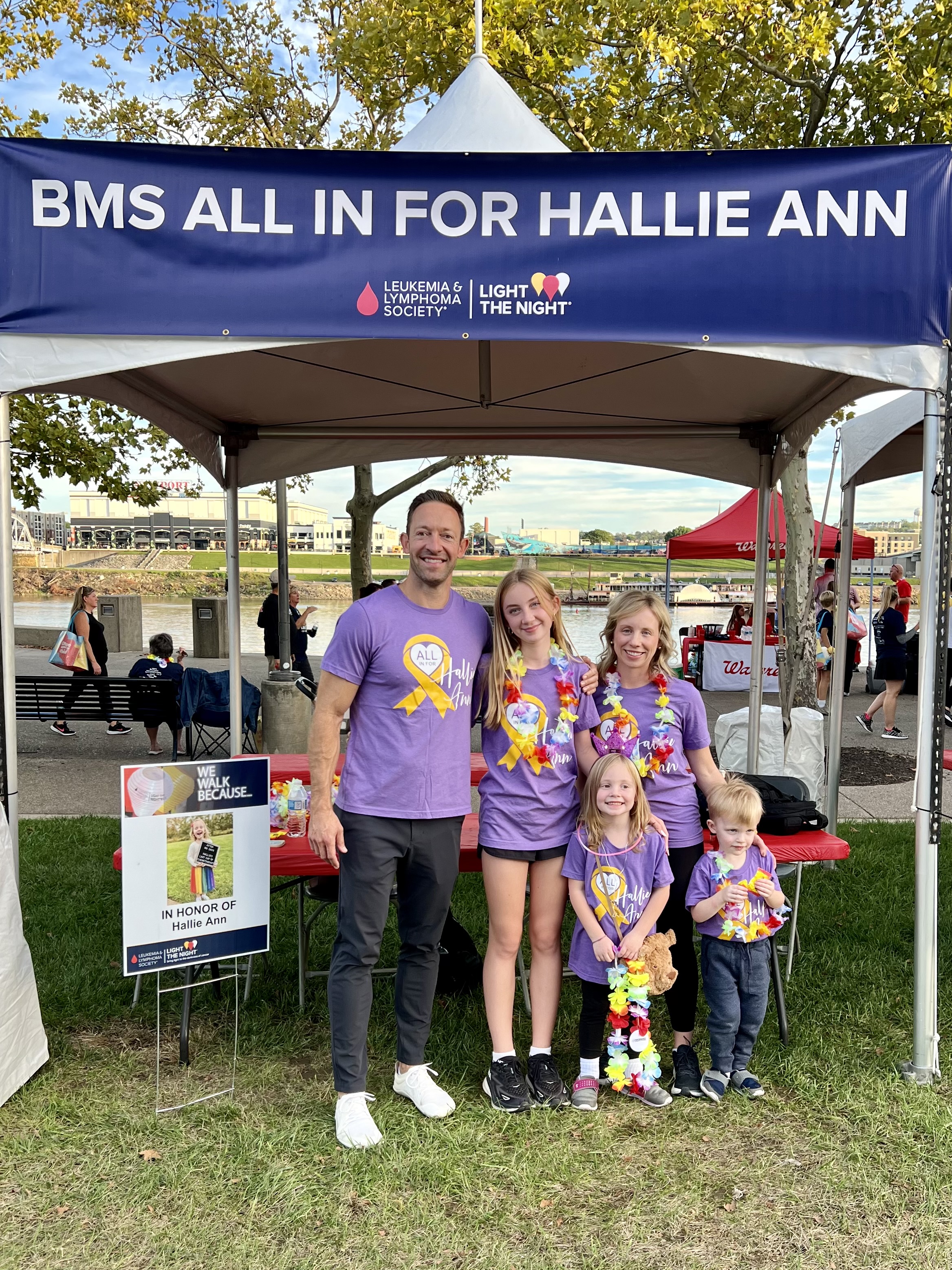 "This is a family photo celebrating our daughter, Hallie, who is a childhood leukemia fighter celebrating almost one year cancer free at the precious age of 5. We are pictured at our 3rd annual Leukemia & Lymphoma Society’s Light the Night Walk in our custom ink tees. This year our team raised over $20,000 for cancer research!"