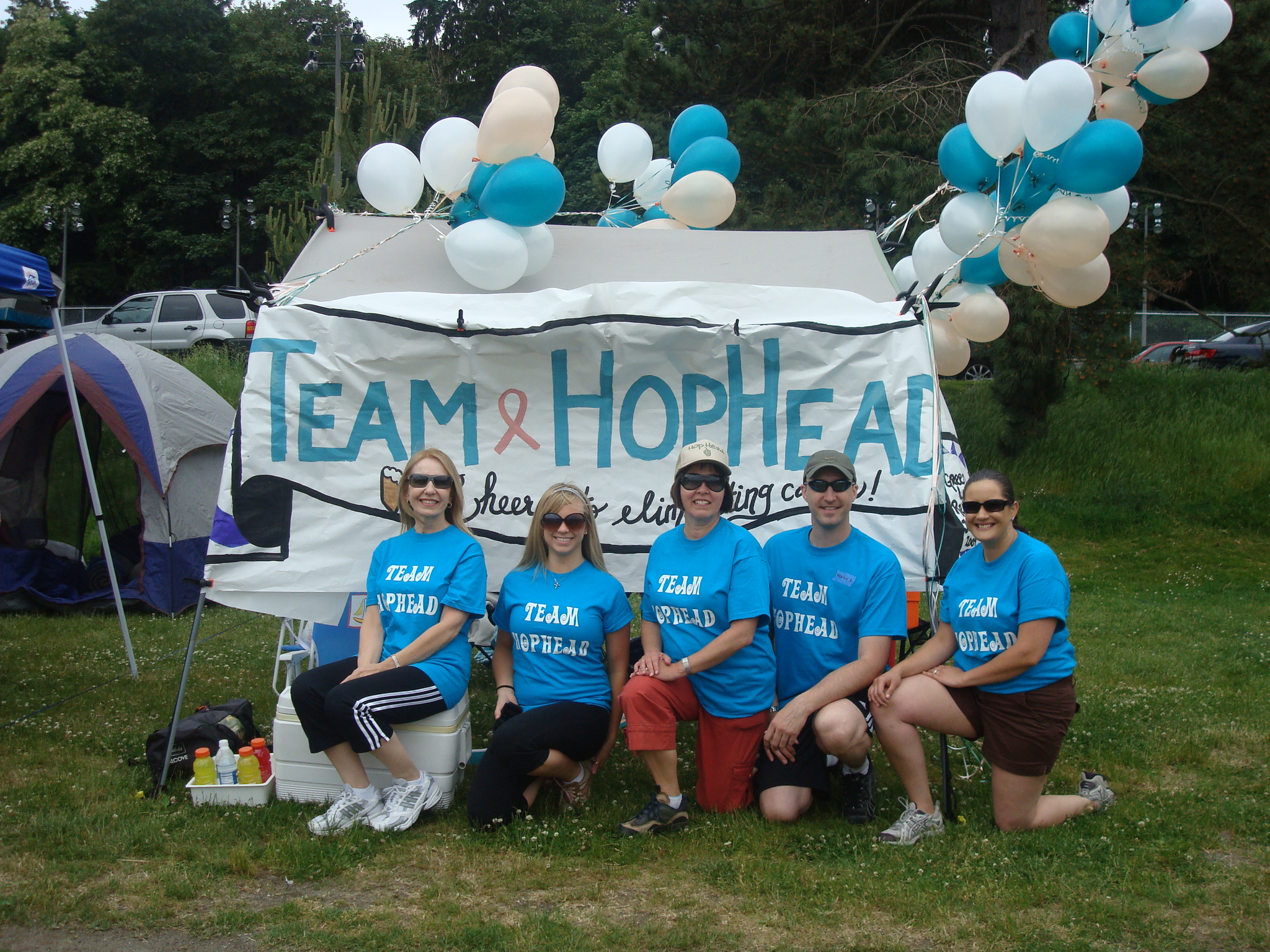 "This photo was taken just as we finished setting up our team tent at the Green Lake Relay for Life in Seattle. We Relay-ed in honor of our friend Mara Upenieks, who is currently undergoing chemotherapy and radiation for uterine cancer. In March, Mara was diagnosed with uterine cancer, only three weeks after her mother was diagnosed with the same disease. Mara's mother lost her fight with cancer in May. Mara remains strong. We Relay-ed because we WILL find a cure."