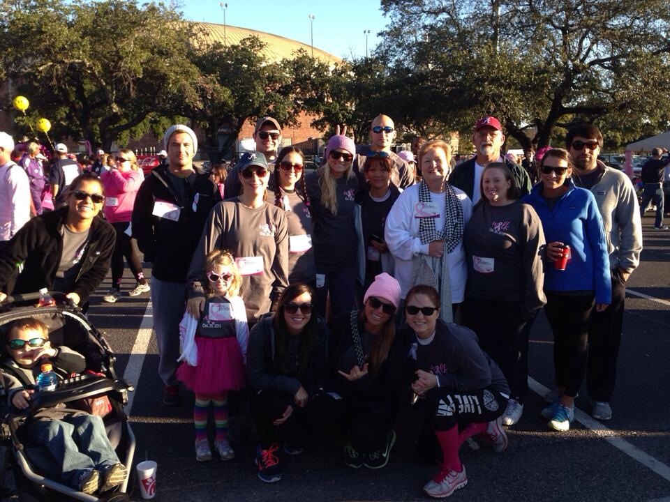 "This photo was taken at the Making Strides Against Breast Cancer Awareness Walk a few weekends ago at the Convention Center in Mobile, AL. We walked for my aunt Jo Webb who is an aunt, mother, sister, and grandmother. She has been diagnosed with breast cancer twice in her lifetime. She beat it the first time 18 years ago and is fighting everyday right now to beat it again. She is the strongest women I have ever known and every year we walk in honour of her. The CustomInk team was AMAZING! Every time I called with a question, a real person answered and talked me through it. They were always so nice and eager to help. Not only were they helpful but they also donated $20 to our charity fund for breast cancer! "