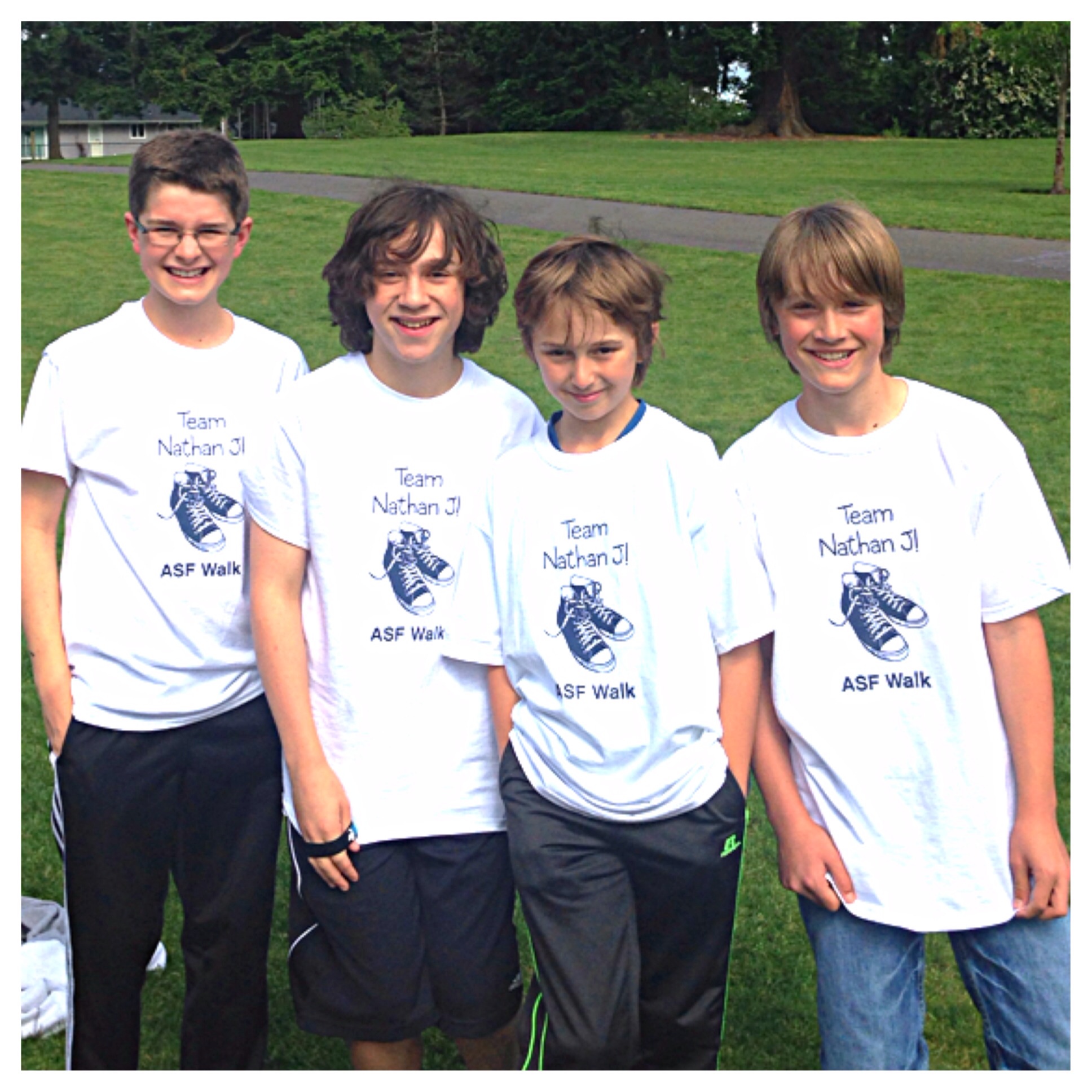 "Photo of 4 boys who supported Nathan in the Angelman Syndrome Foundation fundraiser walk! We got so many great compliments on the shirts!! We were so pleased with how easy your website is to use and design a shirt! We were so appreciative of your donation to this important cause!! Thank you!"