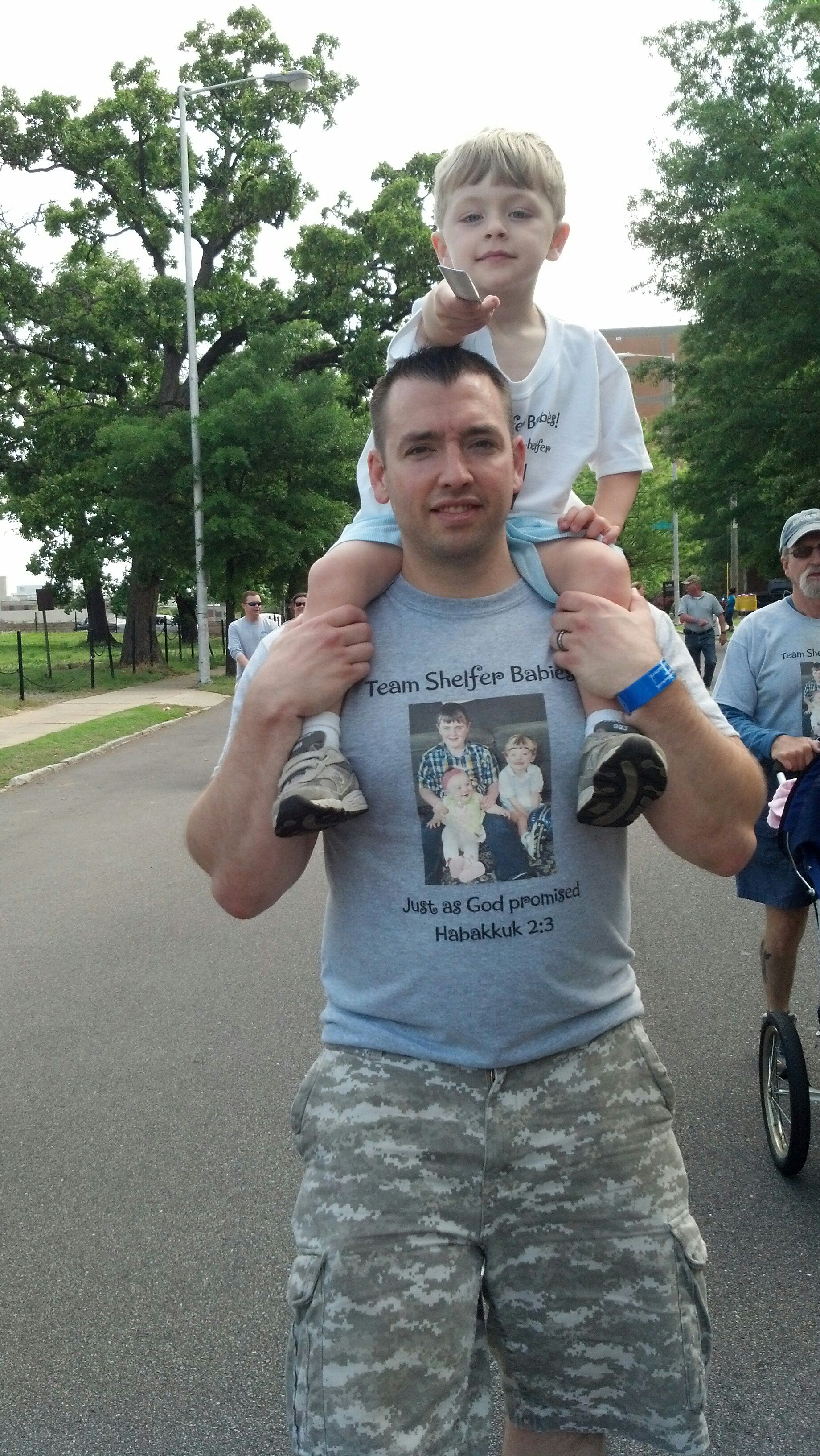 "Our family walks in honor of our oldes son, Tobias "Tobi" Gabriel who was a micro preemie, born 26.4 weeks weighing 2 lbs 3 oz and staying in the NICU for 108 days, having had over 13 surgeries, countless hospitalizations over the first 4 years of his life we practically lived at Children's Hospital here in AL and is hearing impaired. He is truely a miracle. Our daughter Layah Faith came at 23.3 weeks before it was diagnosed I had an incompetent cervix. Layah weighed 1 lb. 4 oz. We walk in her memory as she was with us only 6 days before she stepped into Eternty. We have since had a fullterm son, Luke Jeremiah (pictured-yes we had Luke and Layah) who is now 3, and a daughter Arwyn Hope who is now 9 months old and was a 39 weeker. We have unique shirts for each of our living children. :)"