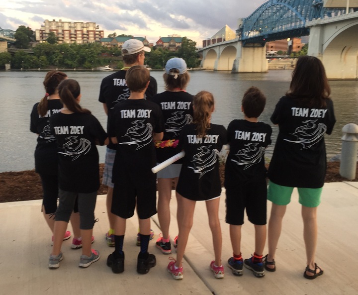 "Zoey had scoliosis surgery right after school was out for the summer so she couldn't participate in the local Color theCurve after Dark 5k. (A scoliosis fundraiser) We formed team Zoey and had shirts made to show her support. We put our school logo on the front and I sent a sidewalk chalk drawing she'd done of a dragon and CustomInk turned it into artwork for the back along with "team Zoey". Our shirts were printed with glow in the dark ink! They were great for the glow run and Zoey loved them!"