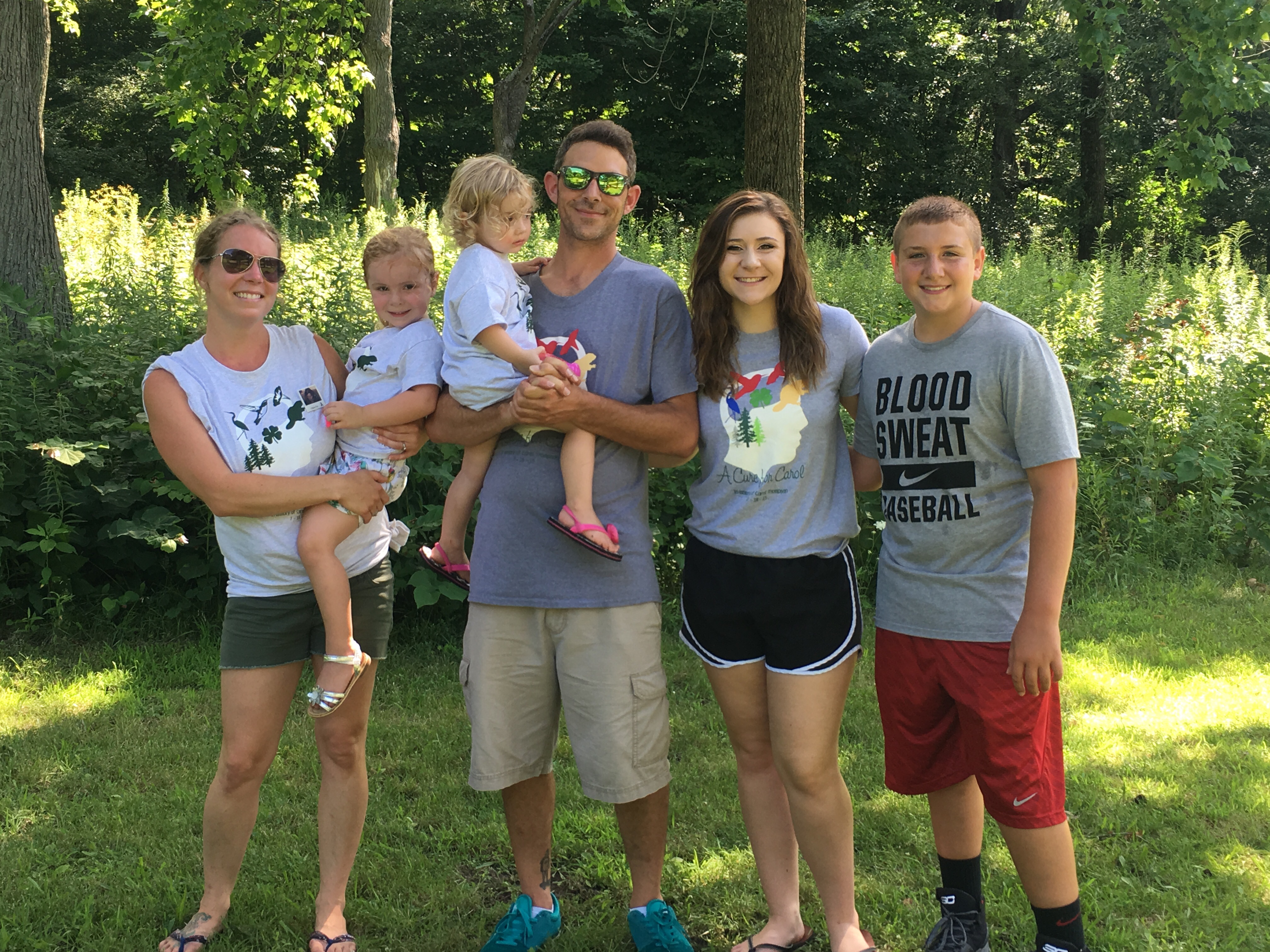 "We were lucky enough to place two shirt orders with two separate customink printings (for over 100 Tshirts distributed in the community and beyond). My mother passed away from a glioblastoma brain tumor last July. Dedicated to preserving her legacy, we started a local event to benefit the National Brain Tumor Society. Pictured are me, my fiancé, our four children. "
