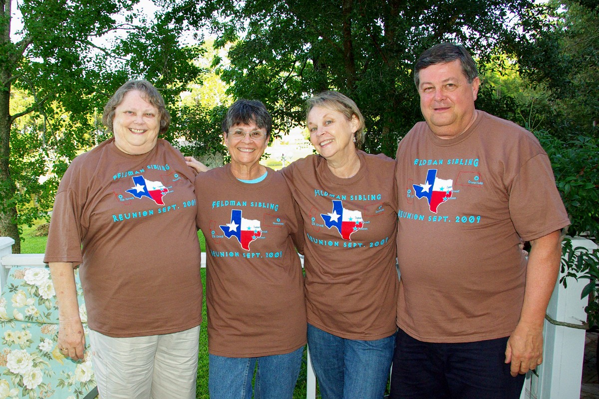 "I created these T-shirts for our recent family reunion in Texas. Shown are the Feldman Siblings who were getting together with their many family members from Texas, California and North Dakota. Everyone loved the t-shirts as a momemto of the reunion and there were even a few tears when I handed them out. CustomInk was wonderful to work with and the web site was very easy to use for a first time t-shirt designer. Thanks so much."