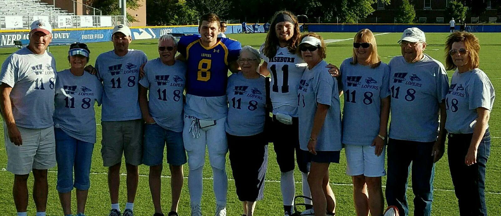 "Our event was the Washburn University vs University of Nebraska-Kearney football game in Kearney Nebraska on September 24, 2016. This was a special game for our family as we had a family member playing on each of the teams. Derek playing for Washburn and Alex playing for UNK. For those family members who were attending the game, we had a dilemma as to which team's shirt we should wear. Thanks to CustomInk, we were able to create a t shirt with both school's logos and our players numbers and names on them. As you can see in the picture, we were able to support both sides with one great t shirt. We received numerous compliments from others at the game about our creative shirt. CustomInk's customer service was fantastic and produced a great shirt within two weeks. Thank you for making our day even more special! By the way, the game was a thriller. Triple overtime with Washburn coming out on top in the end."