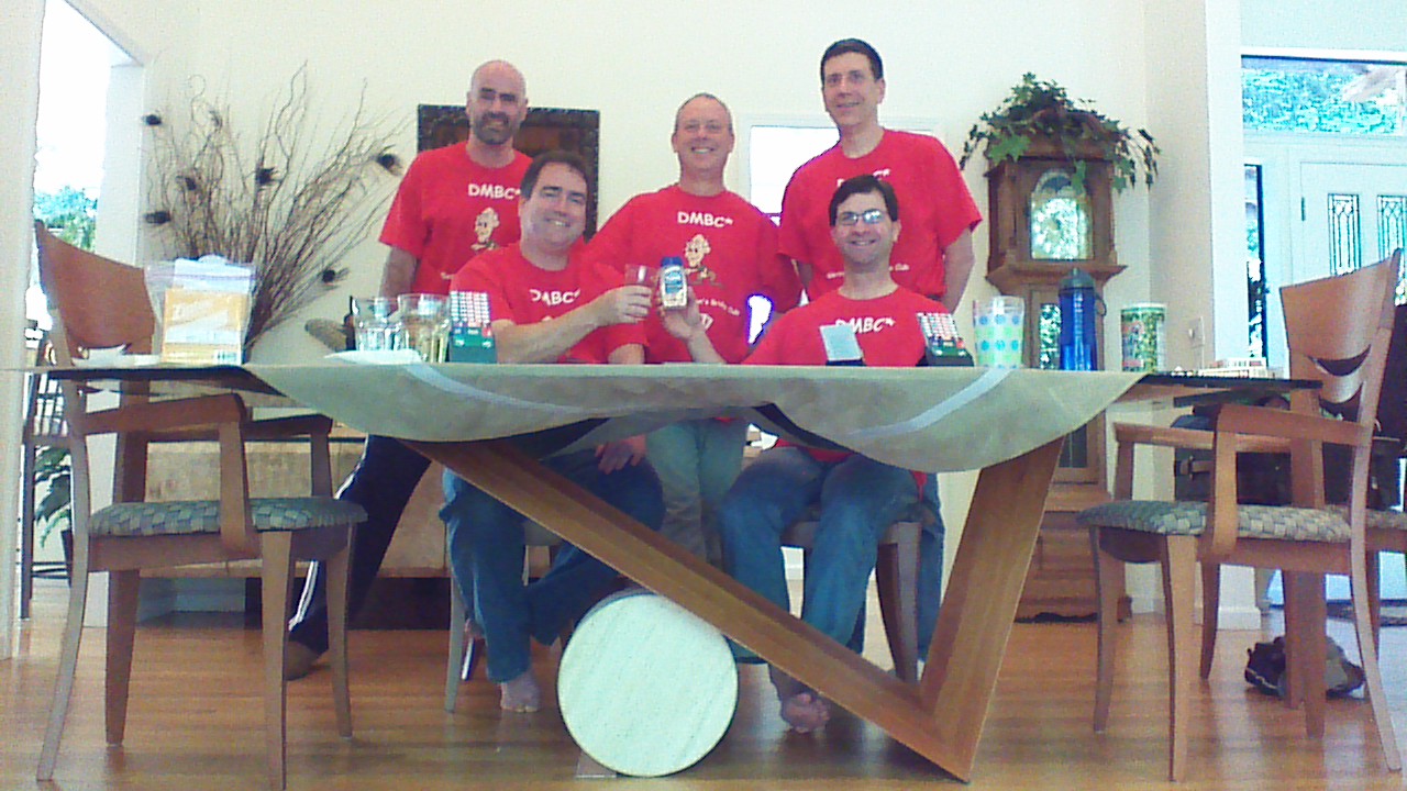 "These guys have been playing bridge together since their college days at Harvey Mudd. The DMBC originally stood for "Drinking Man's Bridge Club" which was all about slow IV drips of Seven and Seven, copious amounts junk food in horrible combinations (cheesy poofs, chocolate covered mini-donut gems, port wine cheese balls, etc.), and very bad bridge for 24 hours a day over three days. Years and years later they are still at it -- travelling from Raleigh, North Carolina, Reno, Nevada, San Diego, California, Seattle, Washington and Oakland, California. Now they are lucky if they last until midnight, sip sparkling water, and eat "real" meals .... I renamed them the Doddering Man's Bridge Club with all due love and respect. This year, I commemorated them with shirts ;o) Aren't they cute??"