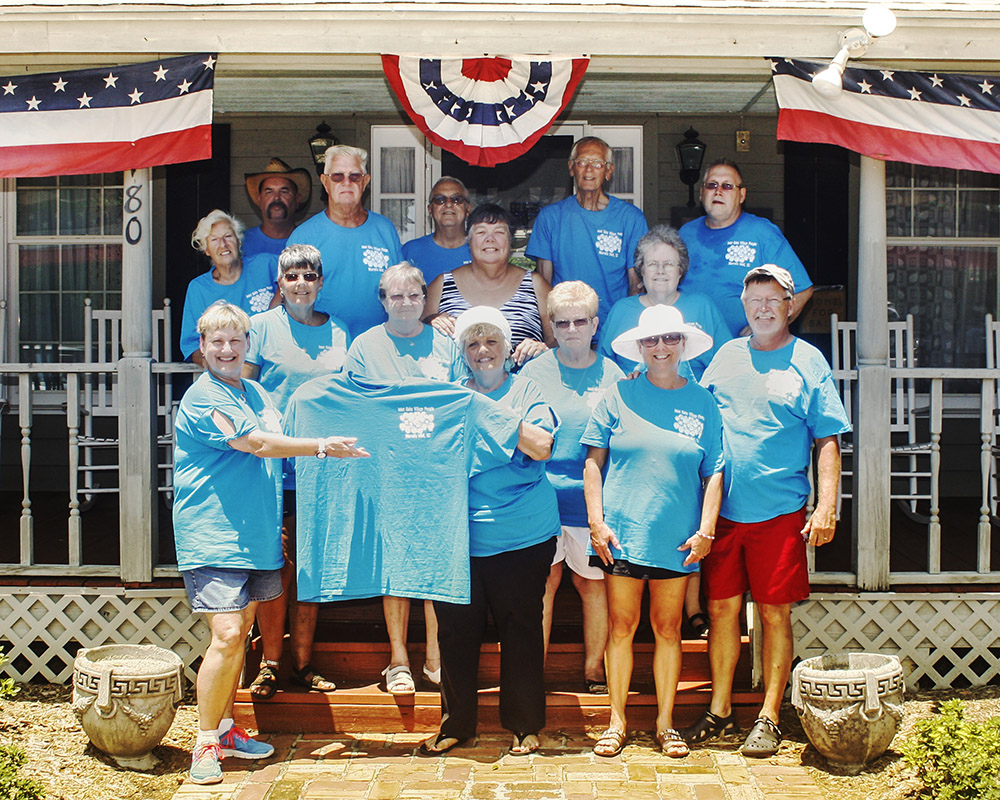 "We live in a 55+ village with an amazing group of many caring individuals. We recently purchased 31 t-shirts with our group name, "Inlet Oaks Village People." We wear them proudly at all of our functions. The people in the village are a big family! We gather together for fun events and if someone is in need, we are always willing as a group to help one another. The picture I uploaded shows some of our group and we're holding an empty "t" in memory of those who have passed. We recently held a "Celebration of Life" event for one of our group who died a few weeks ago. We wore our shirts in his memory. We'll be keeping our fingers crossed for good luck in the contest. Thank you for your amazing products and service!"